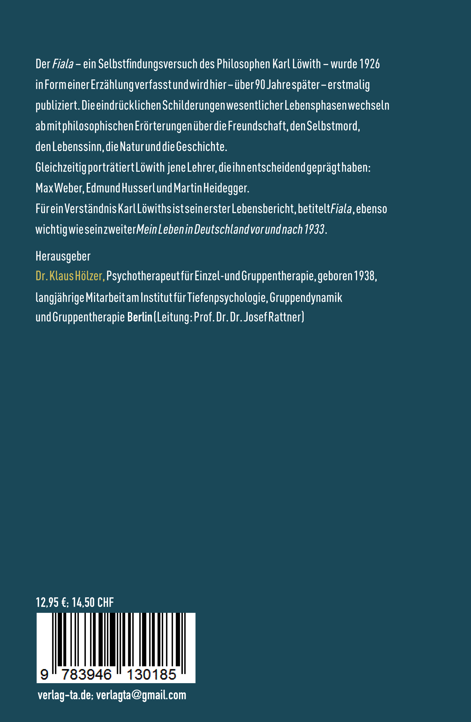 Der "Fiala" – ein Selbstfindungsversuch des Philosophen Karl Löwith – wurde 1926 in Form einer Erzählung verfasst und wird hier – über 90 Jahre später – erstmalig publiziert. Die eindrücklichen Schilderungen wesentlicher Lebensphasen wechseln ab mit philosophischen Erörterungen über die Freundschaft, den Selbstmord, den Lebenssinn, die Natur und die Geschichte. Gleichzeitig porträtiert Löwith jene Lehrer, die ihn entscheidend geprägt haben: Max Weber, Edmund Husserl und Martin Heidegger. Für ein Verständnis Karl Löwiths ist sein erster Lebensbericht, betitelt Fiala, ebenso