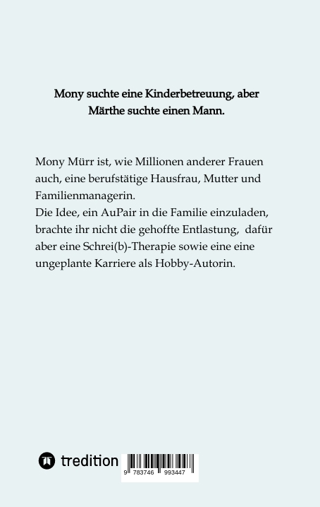 "Hallo, ich bin Mony Mürr und ich bin Autorin.“ So wird in den Filmen immer die Vorstellungsrunde bei Selbsthilfegruppen dargestellt. Eigentlich ist mein Name nicht Mony und meinen Lebensunterhalt verdiene ich auch nicht als Autorin, sondern in einem ganz normalen Beruf. Ich bin eine berufstätige Hausfrau und Mutter, Jahrgang 1972, und lebe mit meiner Familie in der Nähe von Köln. Viele Jahre lang wurden wir von der besten Tagesmutter der Welt unterstützt, bis diese beschlossen hat in den wohlverdienten Ruhestand zu gehen. Ich habe nach einer Alternative gesucht und kam auf die Idee ein AuPair als „große Schwester“ für meine Kinder aufzunehmen. Das, was ich in dieser Zeit erlebt habe, ist der Grund dafür, dass ich meine eigene 1-Frau-Selbsthilfe-Gruppe gegründet habe, die „Anonyme Schreiberin“ - Schreiben statt Schreien als Therapieform. Ich habe auf die Tastatur des PCs eingehauen und schweigend Wörter auf den Monitor geschmissen, einige Wochen lang, bis ich mehrere tausend in verschiedenen Texten gesammelt hatte, die meine Unzufriedenheit Kund taten. Mein Umfeld empfand diese Texte als kurzweilig und amüsant (wenn zwei sich streiten freut sich der Dritte) und als gut genug, um daraus ein Buch zu machen. So ist "AuPair? - Au weh!" entstanden ...