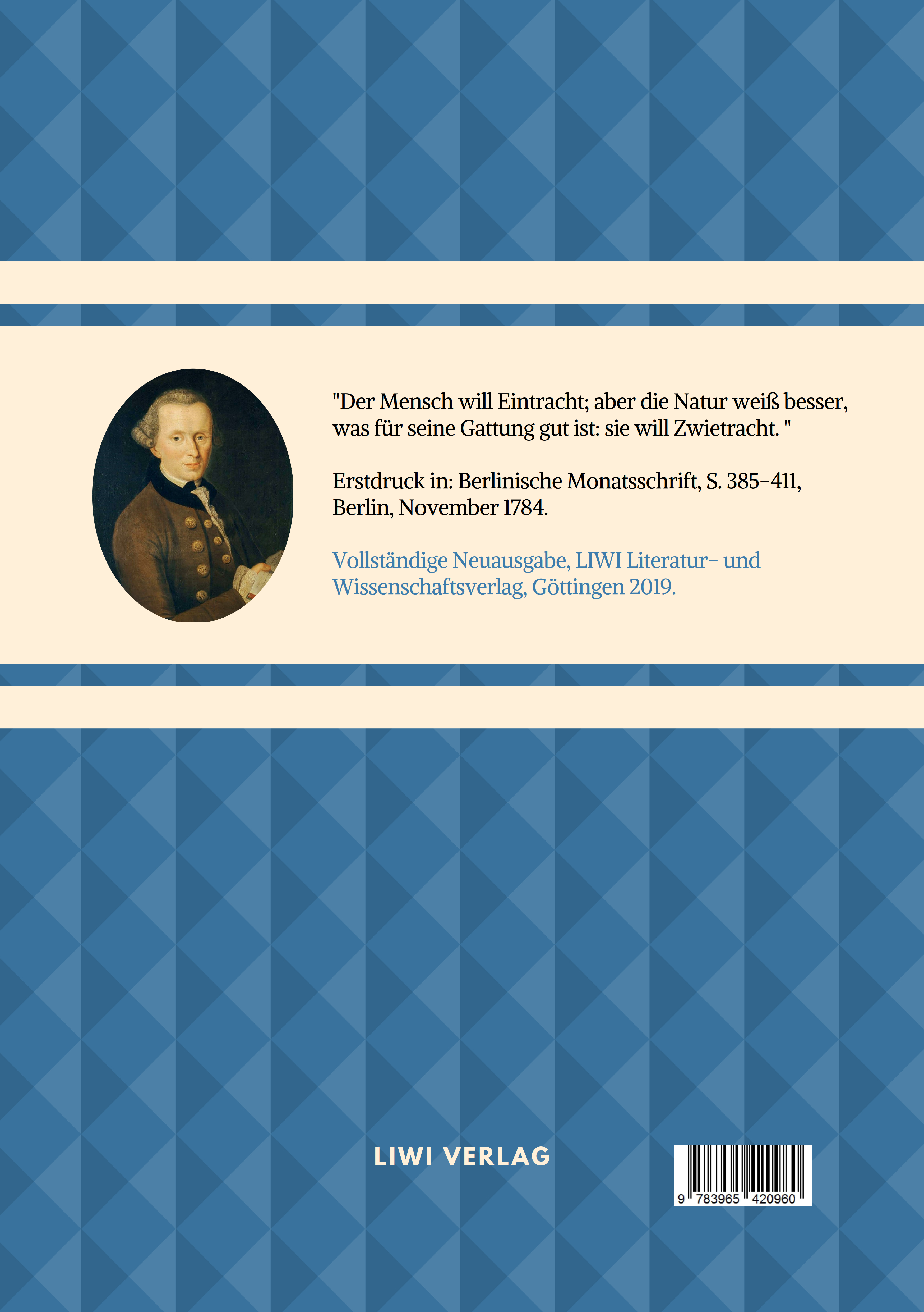 "Der Mensch will Eintracht; aber die Natur weiß besser, was für seine Gattung gut ist: sie will Zwietracht." Immanuel Kant.Idee zu einer allgemeinen Geschichte in weltbürgerlicher Absicht.Erstdruck in: Berlinische Monatsschrift, S. 385-411, Berlin, November 1784.Vollständige Neuausgabe, Göttingen 2019.LIWI Literatur- und Wissenschaftsverlag.