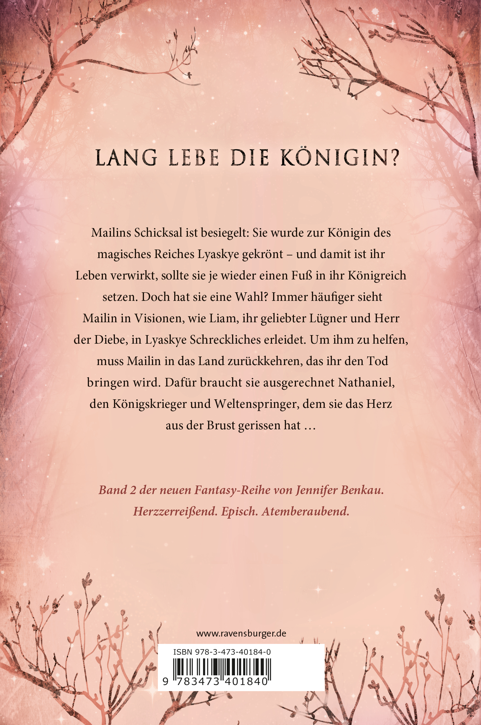 Mailins Schicksal ist besiegelt: Sie wurde zur Königin von Lyaskye gekrönt und damit ist ihr Leben verwirkt, sollte sie je wieder einen Fuß in ihr Königreich setzen. Allerdings ist genau das Mailins Ziel. Denn wie soll sie in ihr altes Leben zurückkehren, wenn ihr Herz bei Liam geblieben ist? Mailin muss zu ihm, koste es, was es wolle. Doch um nach Lyaskye zurückzukehren, braucht sie ausgerechnet Nathaniel, den Königskrieger und Weltenspringer, dem sie das Herz aus der Brust gerissen hat ...