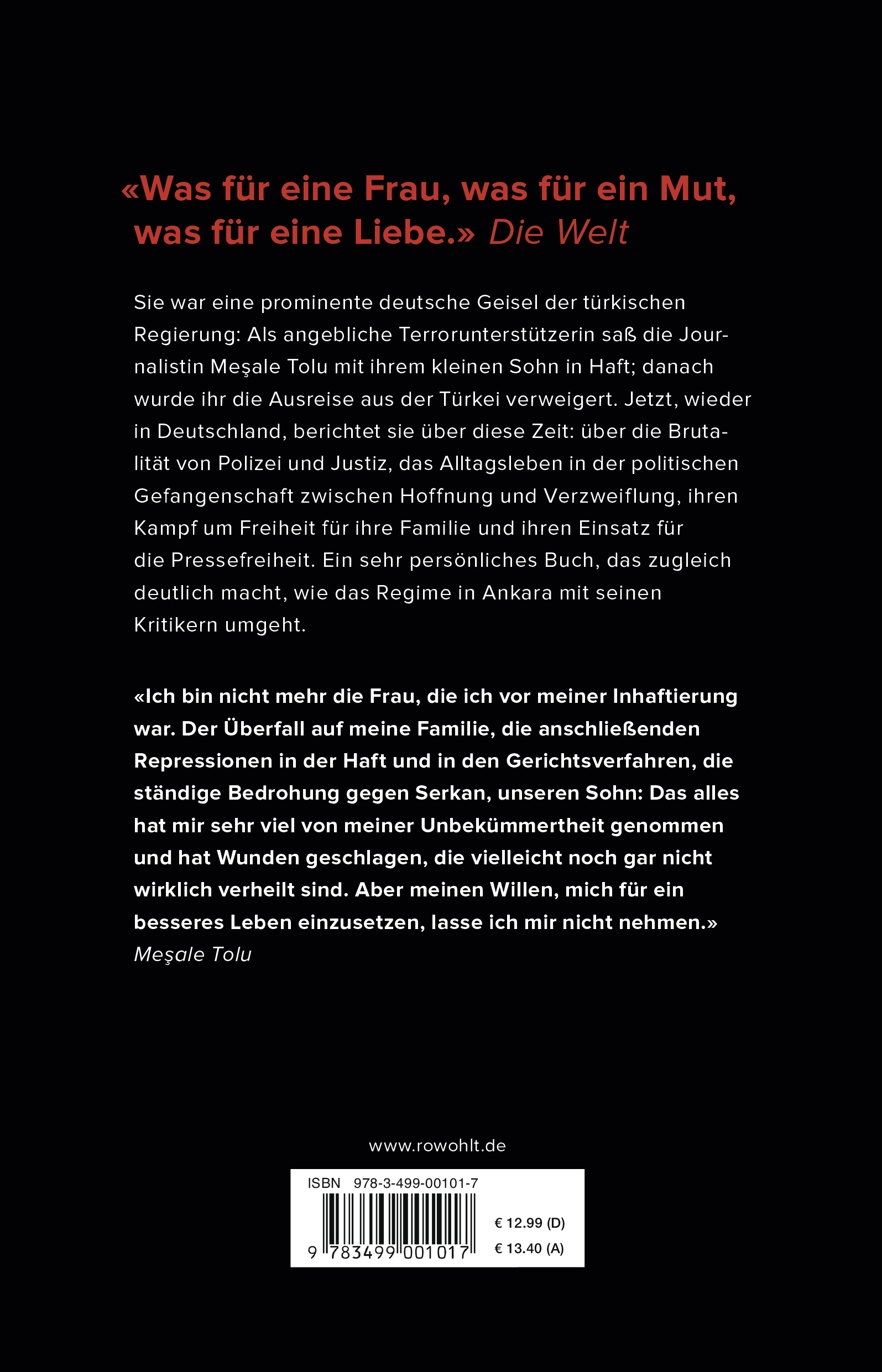 Meşale Tolu ist eine deutsche Journalistin und Übersetzerin kurdischer Herkunft. Sie wuchs in Ulm auf und studierte in Frankfurt Ethik und Spanisch. 2007 erhielt sie die deutsche Staatsbürgerschaft und legte zugleich die türkische ab. Ende April 2017 wurde sie in ihrer Istanbuler Wohnung von einer türkischen Antiterror-Einheit als "Terroristin" verhaftet. Ihr Schicksal und das anderer in der Türkei inhaftierter Journalisten hat zahlreiche Medienberichte, Unterstützerkampagnen und diplomatische Aktivitäten ausgelöst. Am 18. Dezember 2017 wurde sie unter Auflagen aus der Haft entlassen, am 20. August 2018 hob ein Gericht die Ausreisesperre gegen Tolu auf, erst zwei Monate später die gegen ihren ebenfalls inhaftierten Ehemann Suat Çorlu. Meşale Tolu lebt mit ihrer Familie in Neu-Ulm.