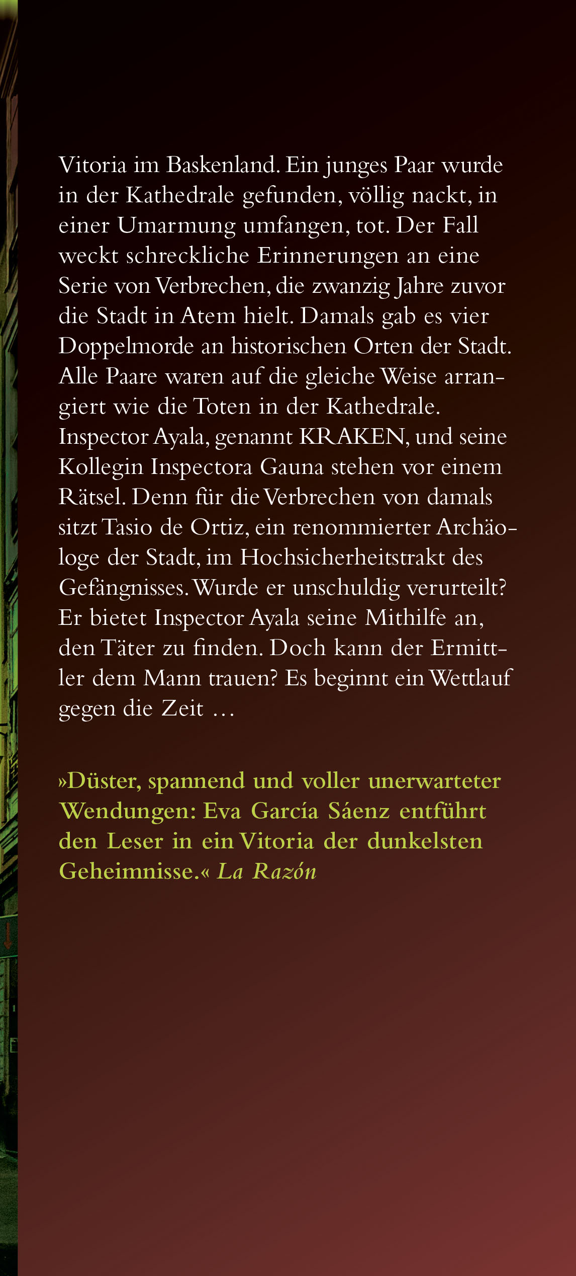 Zwanzig Jahre zuvor gab es fünf Doppelmorde an historischen Orten der Stadt - alle Paare auf die gleiche Weise arrangiert wie die Toten in der Kathedrale. Der Ermittler Unai López und seine Kollegin Ruiz stehen vor einem Rätsel.