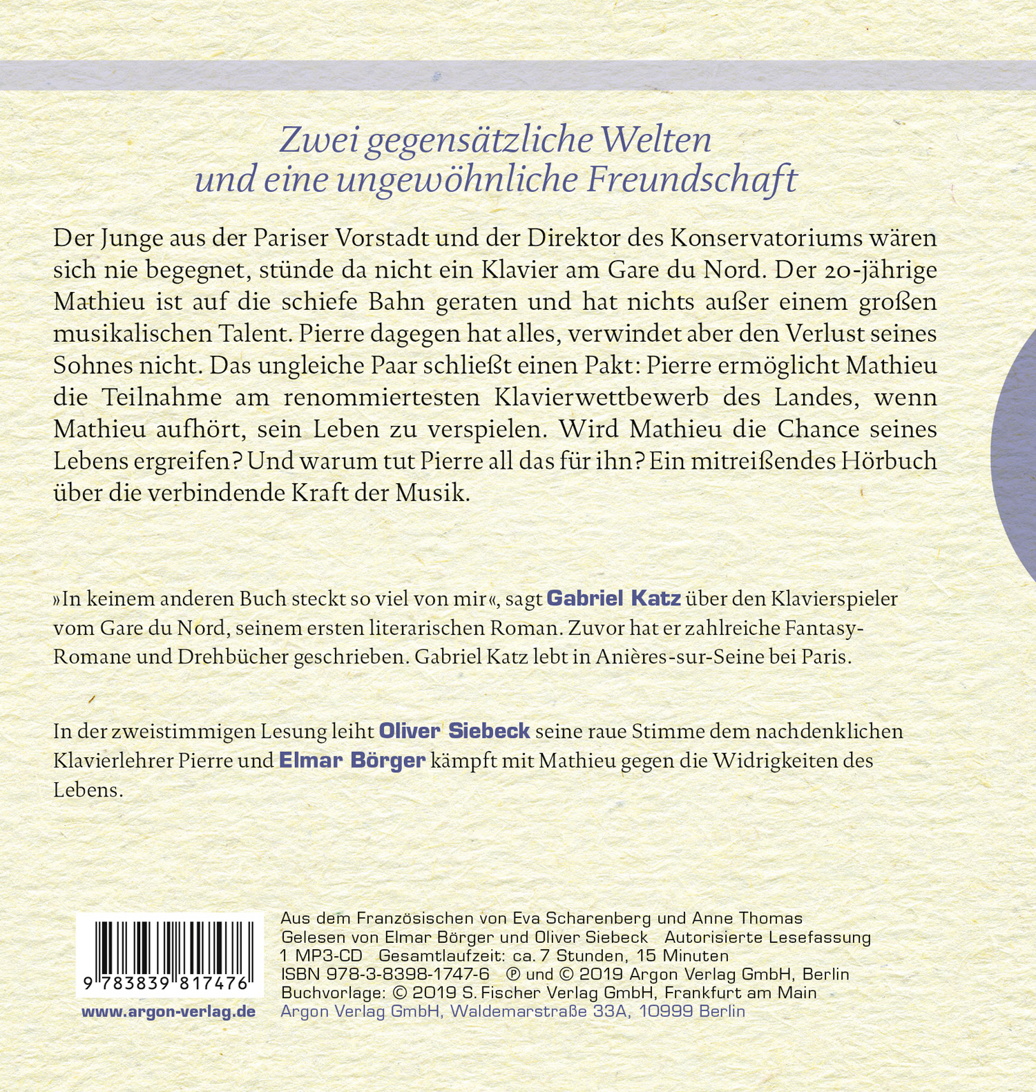 Katz, Gabriel »In keinem anderen Buch steckt so viel von mir«, sagt Gabriel Katz über den 'Klavierspieler vom Gare du Nord', seinem ersten literarischen Roman. Zuvor hat er zahlreiche Fantasy-Romane und Drehbücher geschrieben. Gabriel Katz lebt in Paris, genauer in Anières-sur-Seine bei Paris. Börger, Elmar Elmar Börger ist neben seiner Arbeit am Theater ein mitreißender Vorleser: Seine junge, tiefe Stimme macht das Gehörte unmittelbar erlebbar. Siebeck, Oliver Oliver Siebeck ist ein bekannter Synchronsprecher für Fernsehen und Film. So leiht er seine Stimme u. a. Schauspielern wie Daniel Craig, Greg Grunberg oder Scott Patterson. Zudem ist Siebeck ein beliebter Hörbuchsprecher, dessen dunkle, raue Stimme große Spannung erzeugt. Oliver Siebeck lebt in Berlin.