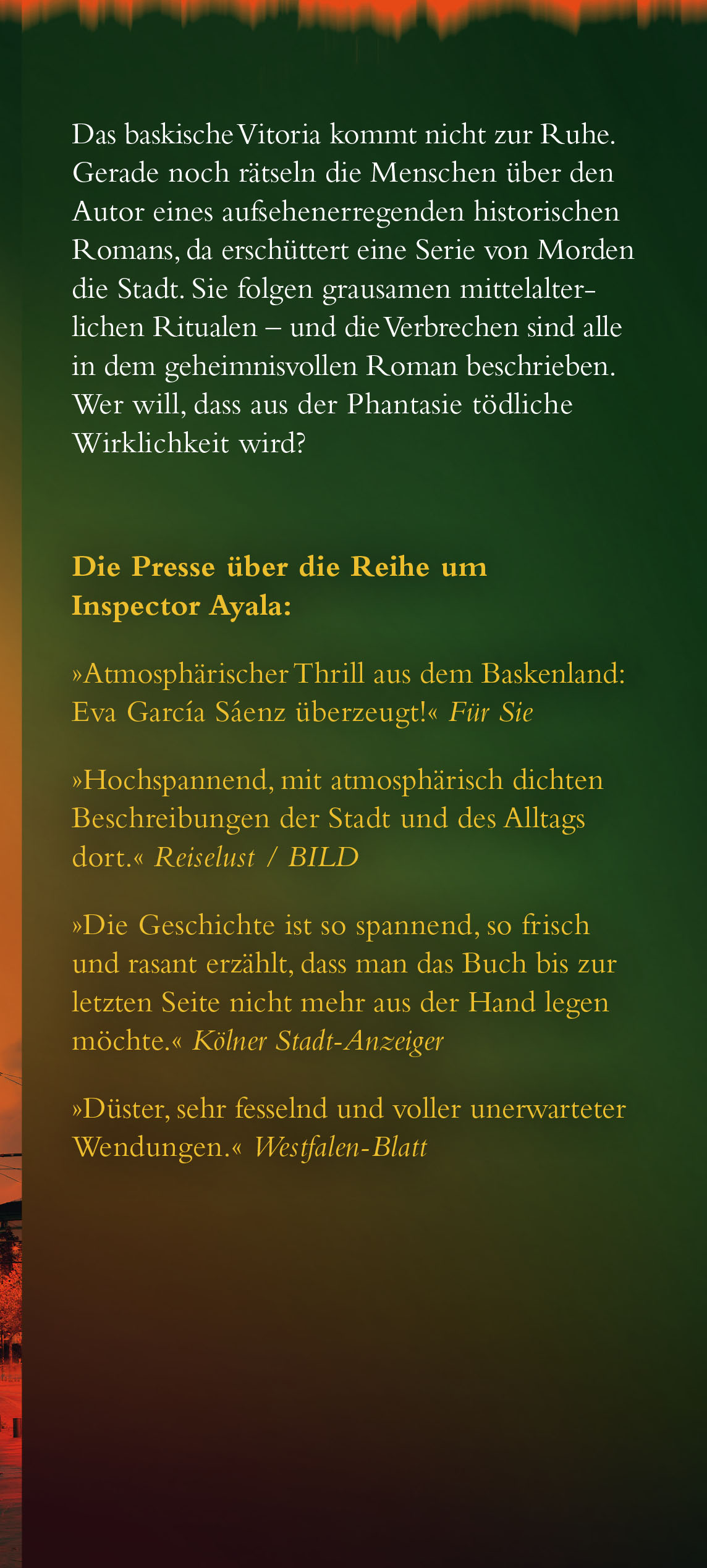 Vitoria im Baskenland. Wieder erschüttert eine Serie von Morden die Stadt. Sie folgen düsteren mittelalterlichen Ritualen. Inspector Ayala alias Kraken muss feststellen, dass die Verbrechen alle in einem geheimnisvollen historischen Roman beschrieben sind.