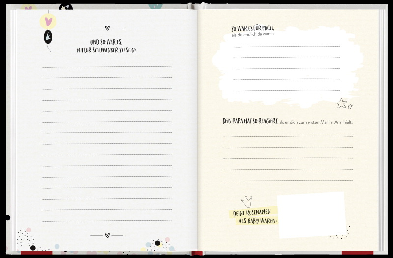 Auf den 64 Seiten des Eintragebuchs ist genug Platz, um alles Wichtige zu notieren oder auch mal ein Erinnerungsstück einzukleben. So entsteht im Nu und ohne viel Aufwand ein Erinnerungsalbum für die ersten Lebensjahre des Kindes.