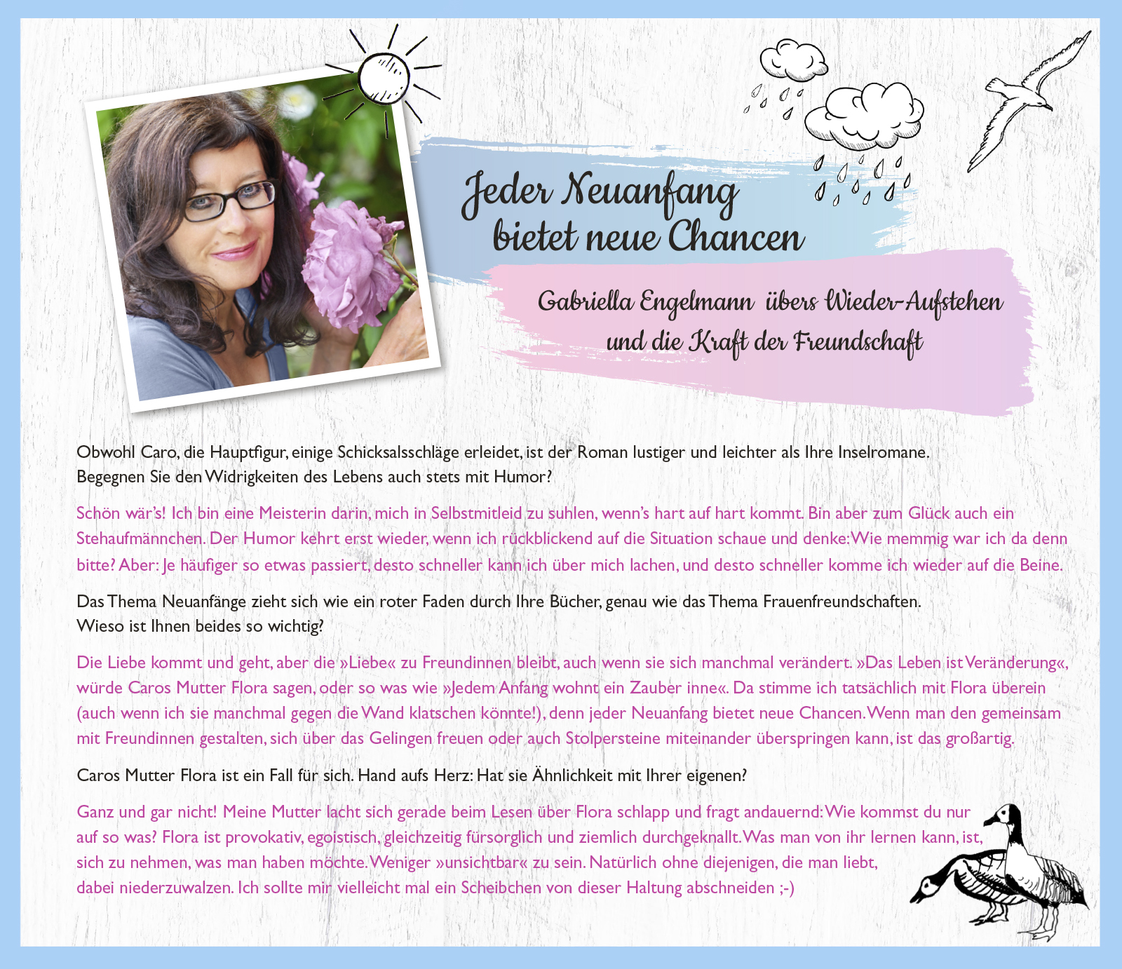 Die gebürtige Münchnerin entdeckte in Hamburg ihre Freude am Schreiben und fühlt sich im Norden pudelwohl. Nach Tätigkeiten als Buchhändlerin, und Verlagsleiterin genießt sie die Freiheit des Daseins als Autorin von Romanen, Kinder- und Jugendbüchern. Seit sie zum ersten Mal an der Nordsee war, träumt sie von einem eigenen Häuschen am Deich, mit einem Garten voller Wildrosen und knorrigen Apfelbäumen. Mehr zur Autorin:Instagram: gabriellaengelmannFacebook: www.facebook.com/AutorinGabriellaEngelmann