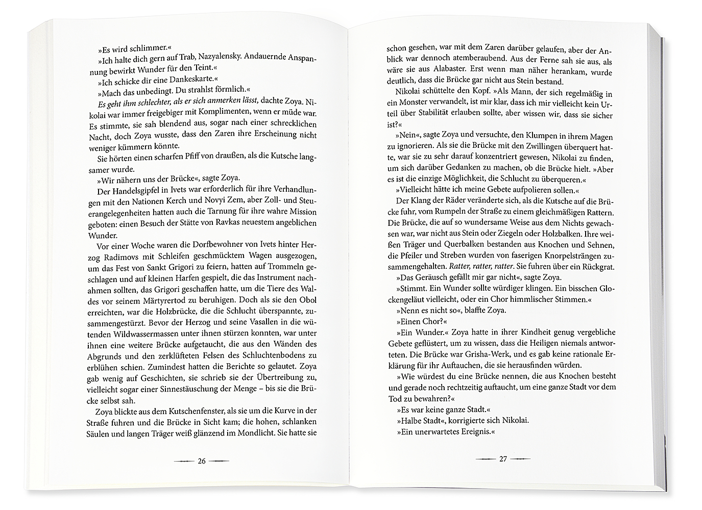 Doch mit jedem Tag wird in dem jungen König eine dunkle Magie stärker und stärker und droht, alles zu zerstören, was er aufgebaut hat. Schließlich begibt Nikolai sich mit einem jungen Mönch und der legendären Grisha-Magierin Zoya auf eine gefährliche Reise zu jenen Orten in Ravka, an denen die stärkste Magie überdauert hat. Möglicherweise besteht so eine Chance, sein dunkles Vermächtnis zu bannen.