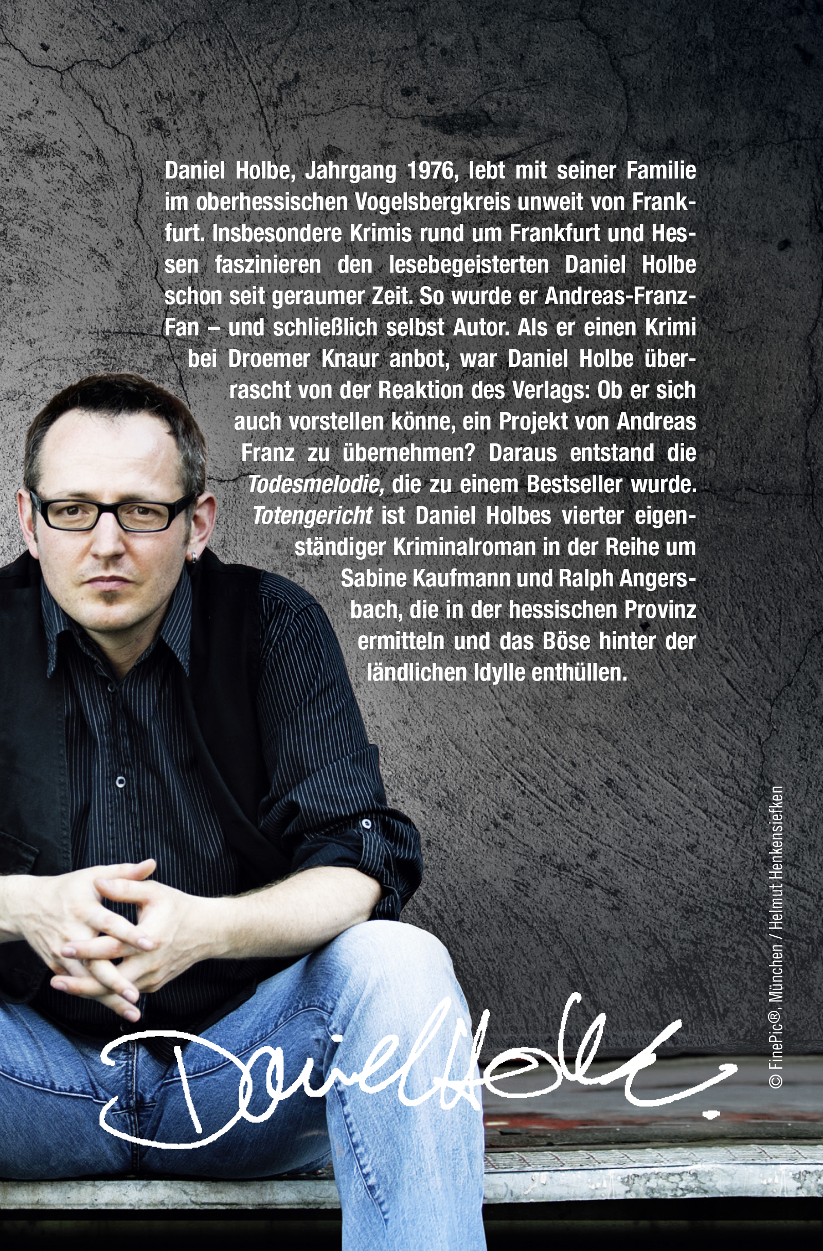Daniel Holbe, Jahrgang 1976, lebt mit seiner Familie in der Wetterau unweit von Frankfurt. Insbesondere Krimis rund um Frankfurt und Hessen faszinieren den lesebegeisterten Daniel Holbe schon seit geraumer Zeit. So wurde er Andreas-Franz-Fan – und schließlich selbst Autor. Als er einen Krimi bei Droemer-Knaur anbot, war Daniel Holbe überrascht von der Reaktion des Verlags: Ob er sich auch vorstellen könne, ein Projekt von Andreas Franz zu übernehmen? Daraus entstand die "Todesmelodie", die zu einem Bestseller wurde. Nach"Giftspur", "Schwarzer Mann" und "Sühnekreuz" ist "Totengericht" Daniel Holbes vierter eigenständiger Kriminalroman.
