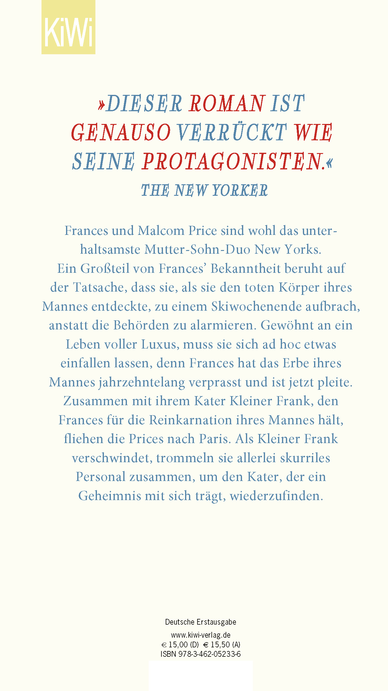 Frances und Malcom Price sind wohl das unterhaltsamste Mutter-Sohn-Duo New Yorks. Ein Großteil von Frances’ Bekanntheit beruht auf der Tatsache, dass sie, als sie den toten Körper ihres Mannes entdeckte, zu einem Skiwochenende aufbrach, anstatt die Behörden zu alarmieren. Gewöhnt an ein Leben voller Luxus, muss sie sich ad hoc etwas einfallen lassen, denn Frances hat das Erbe ihres Mannes jahrzehntelang verprasst und ist jetzt pleite.