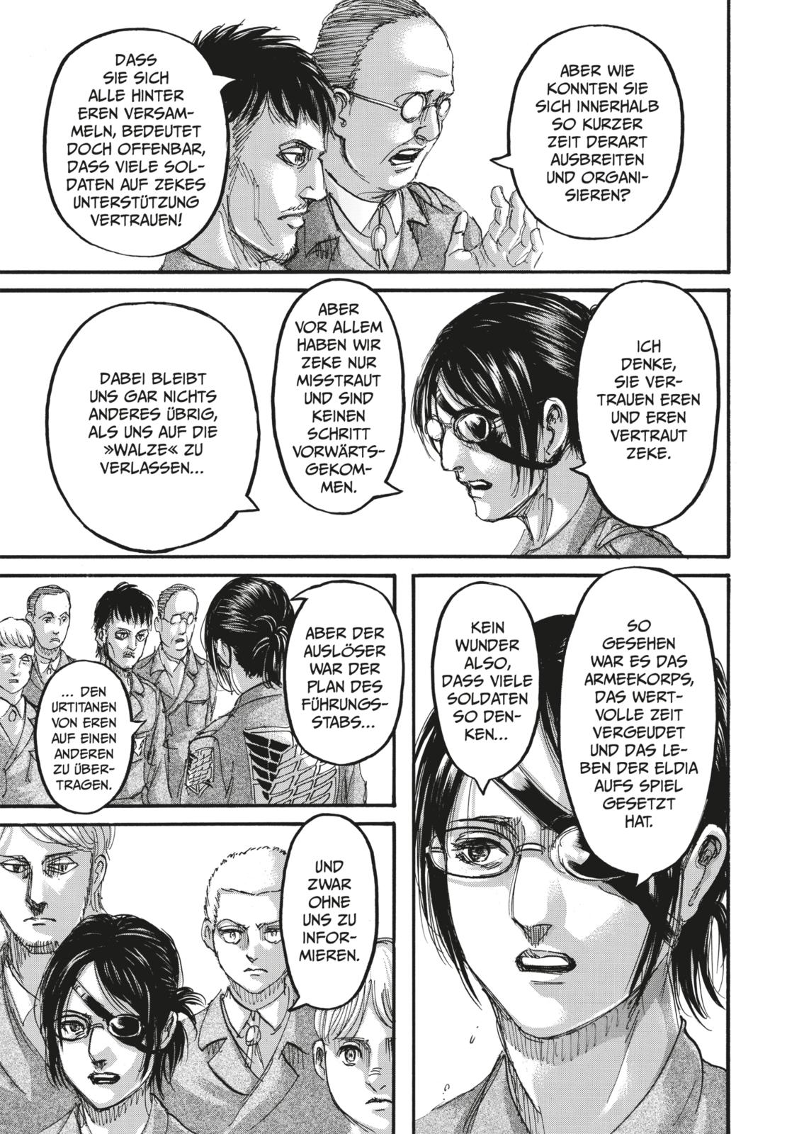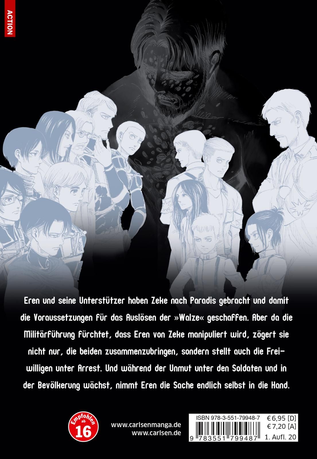 Eren und seine Unterstützer haben Zeke nach Paradis gebracht und damit die Voraussetzungen für das Auslösen der »Walze« geschaffen. Aber da die Militärführung fürchtet, dass Eren von Zeke manipuliert wird, zögert sie nicht nur, die beiden zusammenzubringen, sondern stellt auch die Freiwilligen unter Arrest. Und während der Unmut unter den Soldaten und in der Bevölkerung wächst, nimmt Eren die Sache endlich selbst in die Hand.
