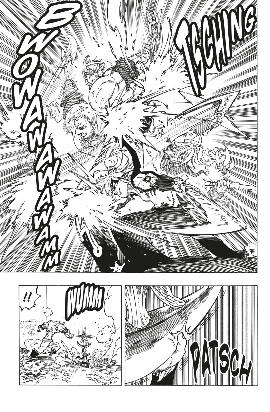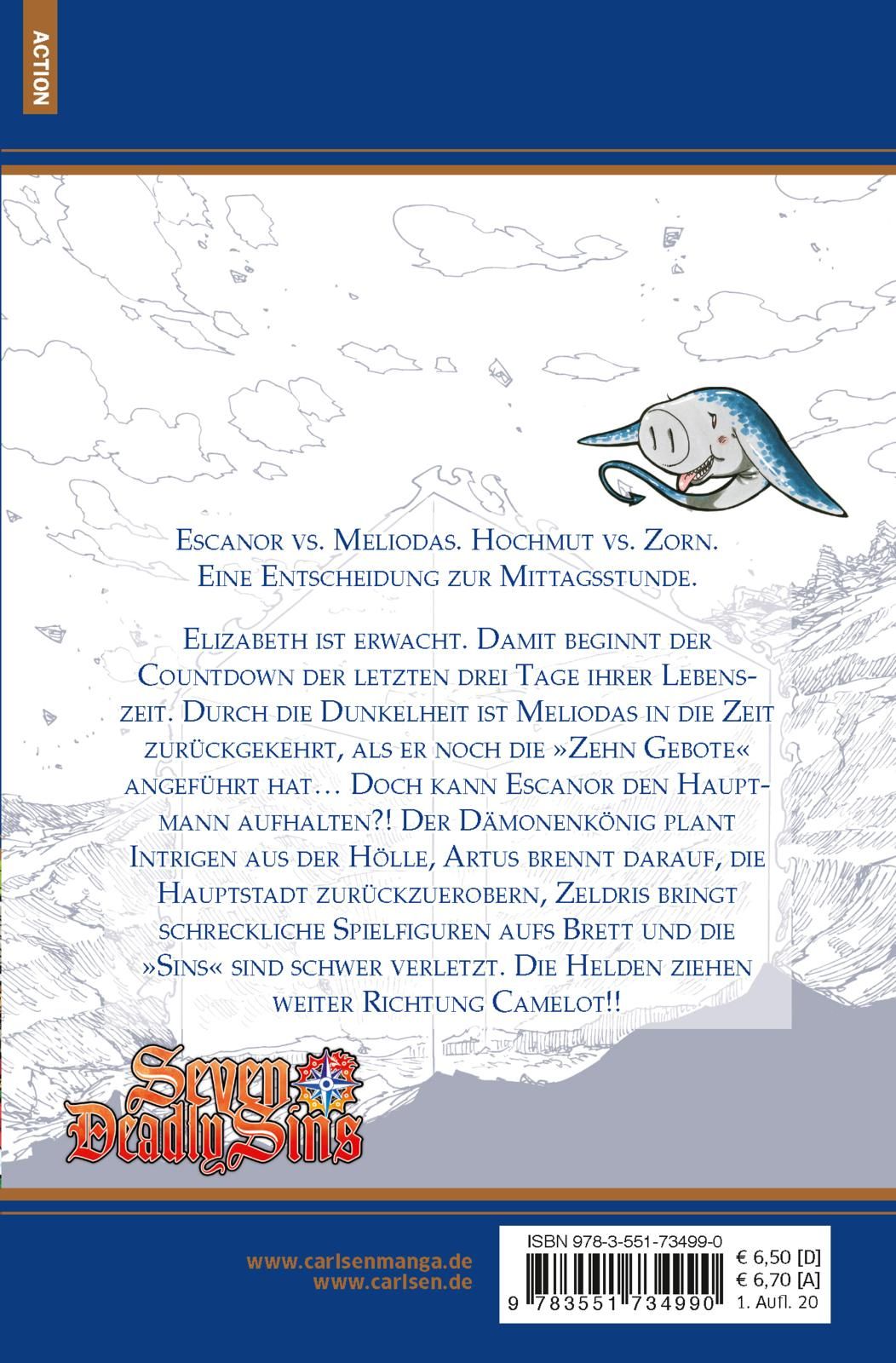 Elizabeth ist erwacht. Damit beginnt der Countdown der letzten drei Tage ihrer Lebenszeit. Durch die Dunkelheit ist Meliodas in die Zeit zurückgekehrt, als er noch die »Zehn Gebote« angeführt hat... Doch kann Escanor den Hauptmann aufhalten?! Der Dämonenkönig plant Intrigen aus der Hölle, Artus brennt darauf, die Hauptstadt zurückzuerobern, Zeldris bringt schreckliche Spielfiguren aufs Brett und die »Sins« sind schwer verletzt. Die Helden ziehen weiter Richtung Camelot!!