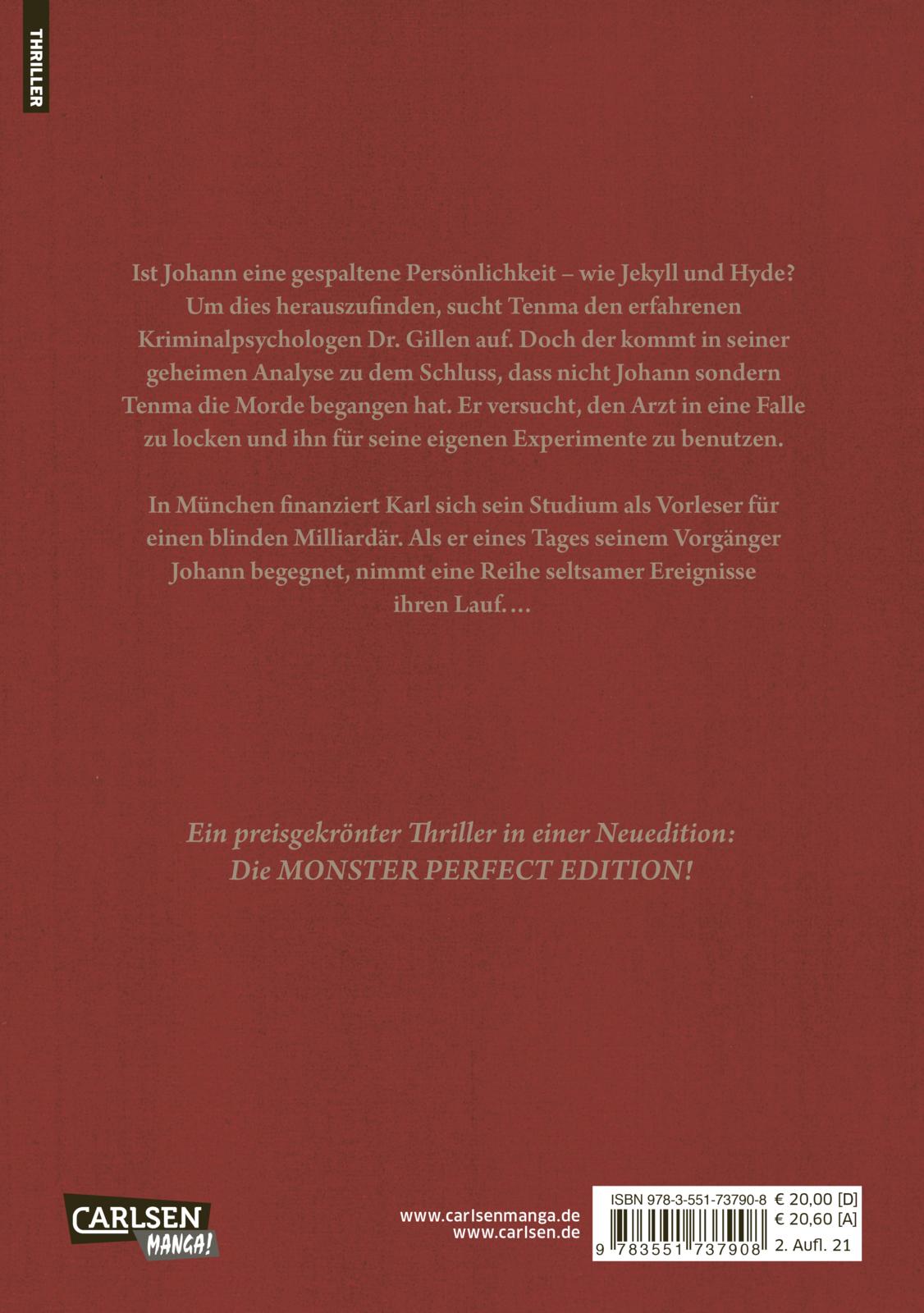 Ist Johann eine gespaltene Persönlichkeit - wie Jekyll und Hyde? Um dies herauszufinden, sucht Tenma den erfahrenen Kriminalpsychologen Dr. Gillen auf. Doch der kommt in seiner geheimen Analyse zu dem Schluss, dass nicht Johann sondern Tenma die Morde begangen hat. Er versucht, den Arzt in eine Falle zu locken und ihn für seine eigenen Experimente zu benutzen. In München finanziert Karl sich sein Studium als Vorleser für einen blinden Milliardär. Als er eines Tages seinem Vorgänger Johann begegnet, nimmt eine Reihe seltsamer Ereignisse ihren Lauf.