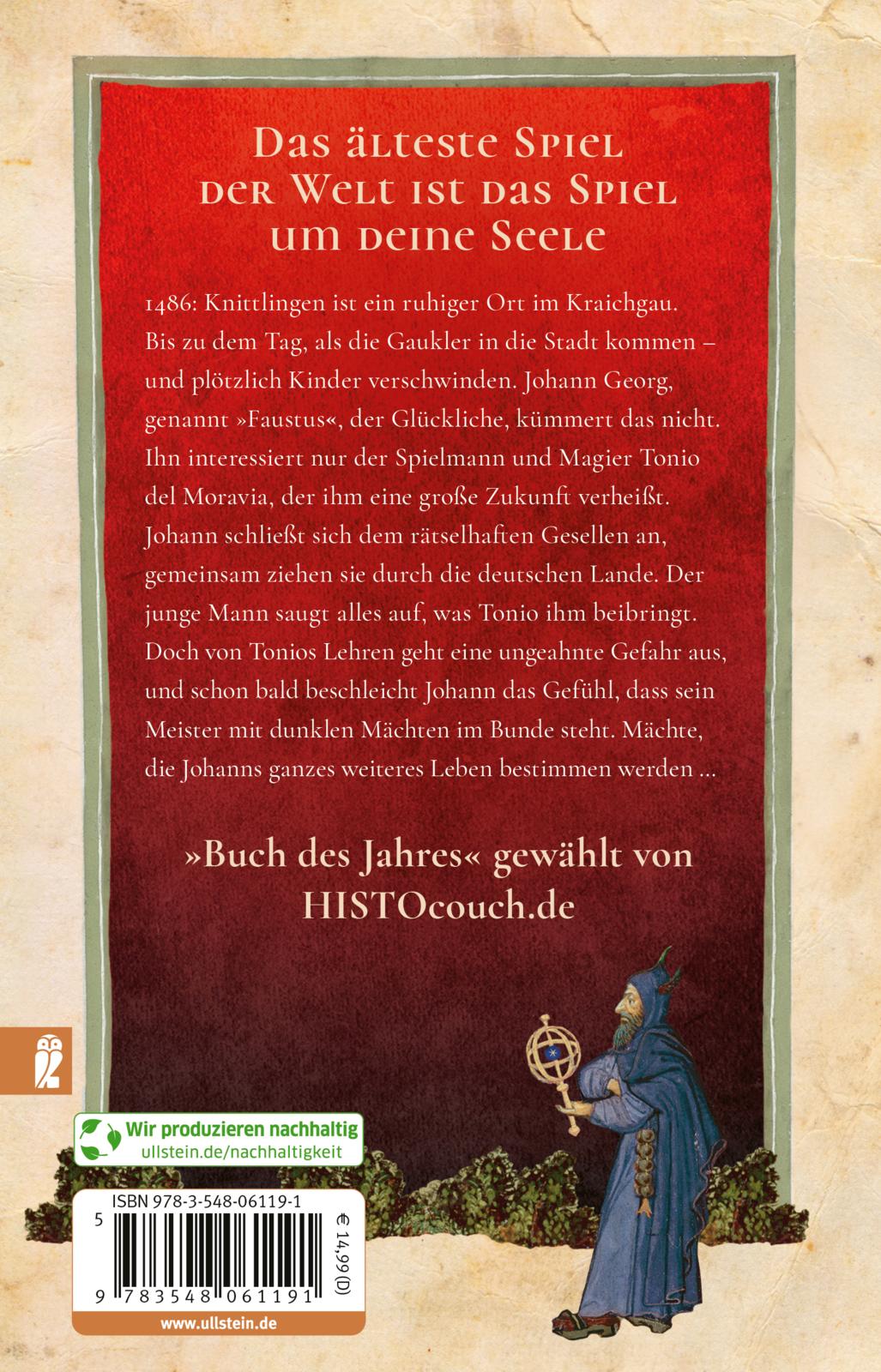 1486: Knittlingen ist ein ruhiger Ort im Kraichgau. Bis zu dem Tag, als die Gaukler in die Stadt kommen - und plötzlich Kinder verschwinden. Johann Georg, genannt "Faustus", der Glückliche, kümmert das nicht. Ihn interessiert nur der Spielmann und Magier Tonio del Moravia: Von dem blassen Mann mit den stechend schwarzen Augen, der Johann eine große Zukunft als Gelehrter voraussagt, geht eine seltsame Faszination aus. Johann schließt sich ihm an, gemeinsam ziehen sie durch die deutschen Lande. Der junge Mann saugt alles auf, was Tonio ihm beibringt. Doch von Tonios Lehren geht eine ungeahnte Gefahr aus, und schon bald beschleicht Johann das Gefühl, dass sein Meister mit dunklen Mächten im Bunde steht. Mächte, die Johanns ganzes weiteres Leben bestimmen werden ...