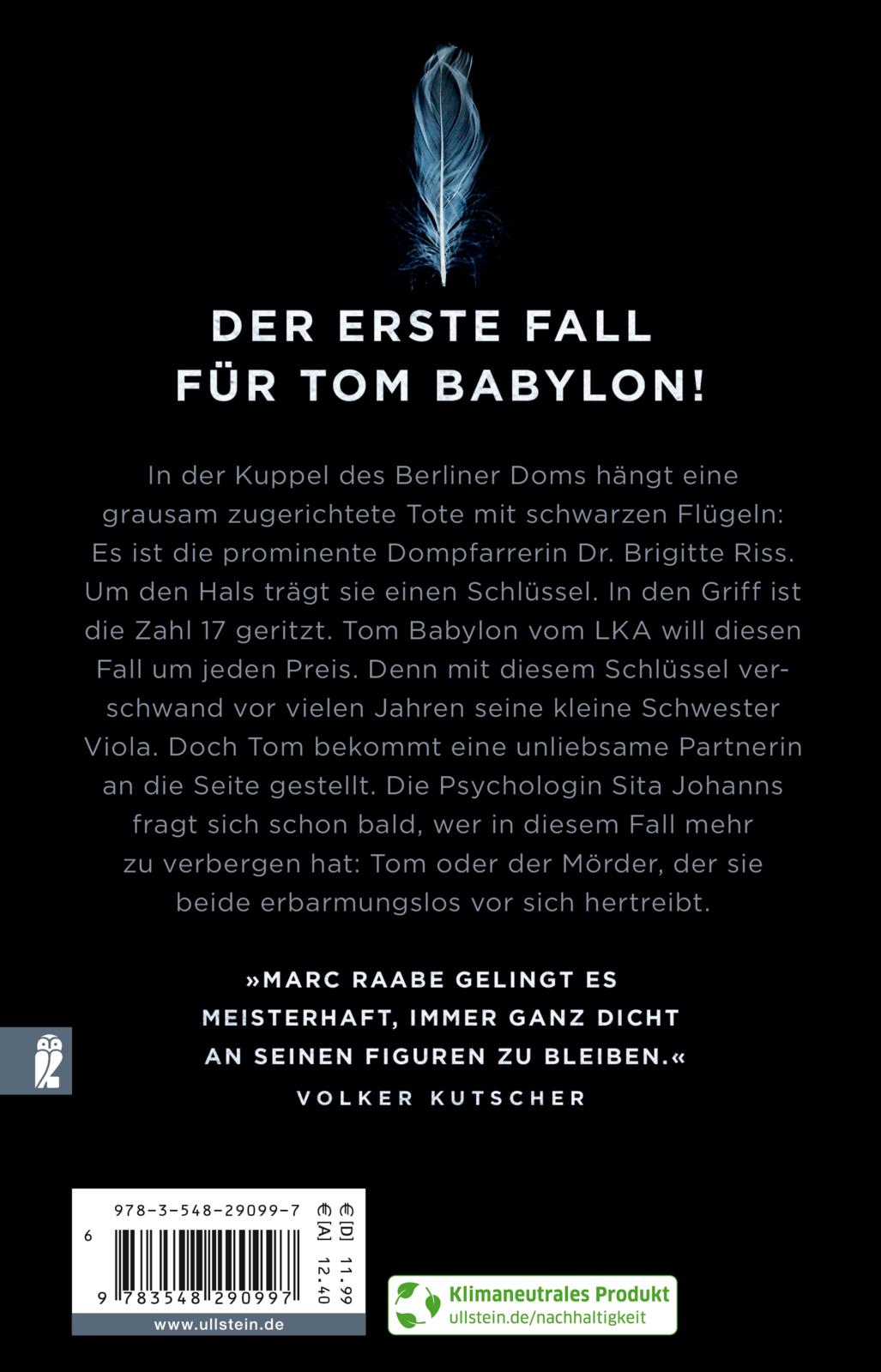 In der Kuppel des Berliner Doms hängt eine grausam zugerichtete Tote mit schwarzen Flügeln: Es ist die prominente Dompfarrerin Dr. Brigitte Riss. Um den Hals trägt sie einen Schlüssel. In den Griff ist die Zahl 17 geritzt. Tom Babylon vom LKA will diesen Fall um jeden Preis. Denn mit diesem Schlüssel verschwand vor vielen Jahren seine kleine Schwester Viola. Doch Tom bekommt eine unliebsame Partnerin an die Seite gestellt. Die Psychologin Sita Johanns fragt sich schon bald, wer in diesem Fall mehr zu verbergen hat: Tom oder der Mörder, der sie beide erbarmungslos vor sich hertreibt.