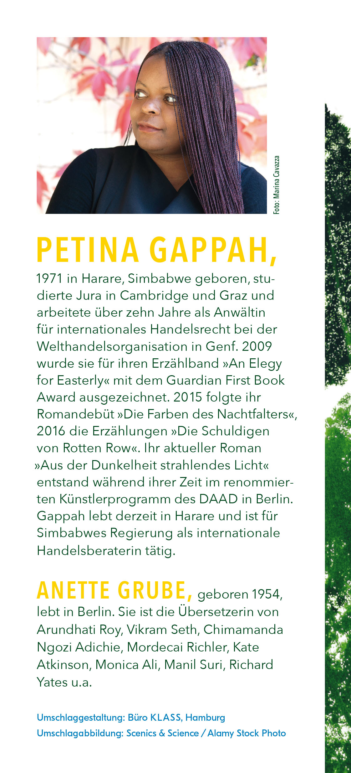 Petina Gappah, 1971 in Harare, Simbabwe geboren, studierte Jura in Cambridge und Graz und arbeitete über zehn Jahre als Anwältin für internationales Handelsrecht bei der WTO in Genf. 2009 erschien ihr erster Erzählband, für den sie mit dem Guardian First Book Award ausgezeichnet wurde. 2015 folgte ihr erster Roman, der auf Deutsch unter dem Titel »Die Farben des Nachtfalters« erschien. Sie lebte in Edinburgh und zuletzt in Berlin, wo sie am renommierten Künstlerprogramm des DAAD teilnahm.