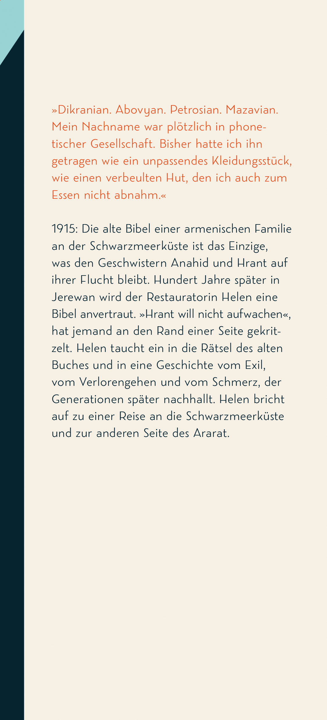 1915: Die alte Bibel einer armenischen Familie an der Schwarzmeerküste ist das Einzige, was den Geschwistern Anahid und Hrant auf ihrer Flucht bleibt. Hundert Jahre später in Jerewan wird der Restauratorin Helen eine Bibel anvertraut. »Hrant will nicht aufwachen«, hat jemand an den Rand einer Seite gekritzelt. Helen taucht ein in die Rätsel des alten Buches, in das moderne Armenien und in eine Geschichte vom Exil, vom Verlorengehen und vom Schmerz, der Generationen später noch nachhallt. Und sie bricht auf zu einer Reise an die Schwarzmeerküste und zur anderen Seite des Ararat.