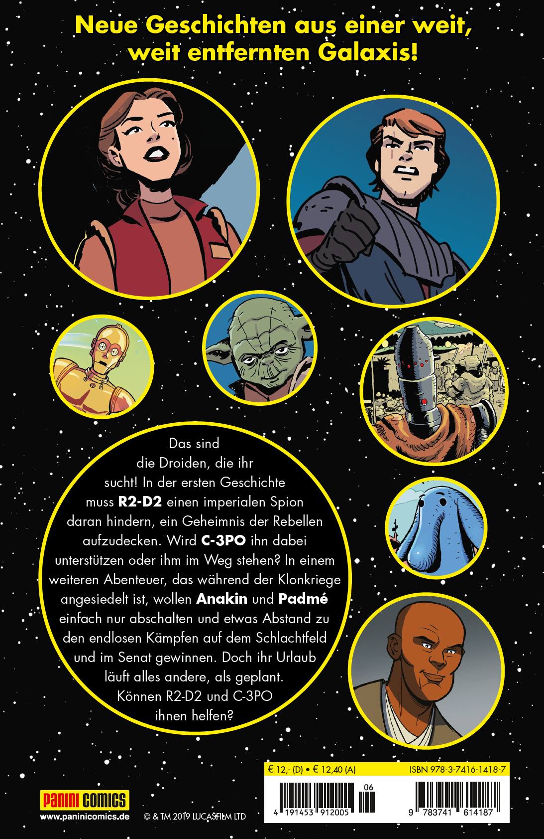 Neue Geschichten aus einer weit, weit entfernten Galaxis!Das sind die Droiden, die ihr sucht! In der ersten Geschichte muss R2-D2 einen imperialen Spion daran hindern, ein Geheimnis der Rebellen aufzudecken. Wird C-3PO ihn dabei unterstützen oder ihm im Weg stehen? In einem weiteren Abenteuer, das während der Klonkriege angesiedelt ist, wollen Anakin und Padmé einfach nur abschalten und etwas Abstand zu den endlosen Kämpfen auf dem Schlachtfeld und im Senat gewinnen. Doch ihr Urlaub läuft alles andere, als geplant. Können R2-D2 und C-3PO ihnen helfen?