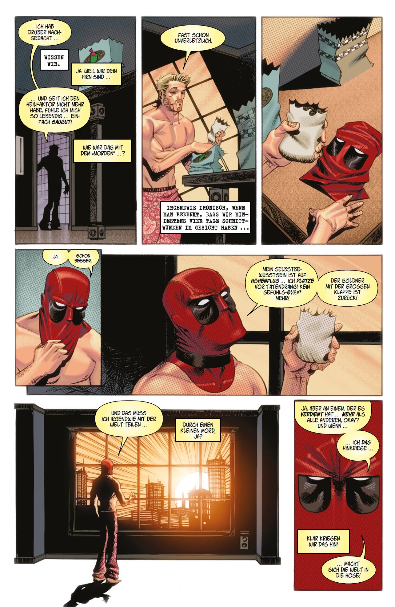 EINLEITUNG von Thomas Witzler Deadpool war fest entschlossen, seinem Dasein ein Ende zu setzen. Leichter gesagt als getan, wenn man nahezu unsterblich ist. Doch plötzlich sah er Licht am Ende des Tunnels, als er von einem Serum hörte, das in der Lage ist, seinen Heilfaktor auszuschalten. Wade fasste einen verwegenen Plan und begann, alle Leute übel vor den Kopf zu stoßen, die ihm über den Weg liefen. Durch das rüde Verhalten hoffte er, irgendjemand werde das gottgesandte Serum verwenden, um ihn ein für alle Mal ins Jenseits zu befördern. Zuerst legte die Labertasche seine Teamgefährten von X-Force herein. Er erzählte ihnen, der Kingpin sei im Besitz des Wundermittels und will es einsetzen, um dem gesamten Volk der Mutanten die Kräfte zu rauben. Als sich das Killerkommando aufmachte, den Verbrecherkönig zu stellen, vereitelte Deadpool die Mission und gefährdete letztlich sein eigenes Team. Das kam gar nicht gut an. Anschließend wollte X-Force dem regenerierenden Degenerierten tatsächlich ans Leder. Derweil konnte der Kingpin nicht verstehen, warum eine Bande zorniger Mutanten hinter ihm her war. Das Serum befand sich nie in seinem Besitz. In Wahrheit war Spider-Mans Gegner Tombstone für die Existenz des Stoffes verantwortlich. Der bleiche Mafioso hatte das Serum anfertigen lassen, weil ihn Deadpool einst hinter Gitter brachte. Daken war es gelungen, den Ursprung der Quelle ausfindig zu machen, den Erfinder des Serums zu töten und sich einer kleinen Menge zu bemächtigen. Damit beabsichtigte der Sohn von Wolverine, seinen eigenen, verhassten Vater auszuschalten. Vergebens. Wie sich herausstellte, wirkt das Serum nur bei Wade. Am Ende war es Deadpools alter Kumpel Hydra-Bob, der Mr. Wilson eine Dosis injizierte. Um an das Serum zu gelangen, hatte Bob mit Tombstone einen Deal geschlossen. Nicht, um seinen Freund zu eliminieren, sondern um ihm den Wert des Lebens zu vermitteln. Nun ist Wade zwar ohne Heilfaktor, aber gleichzeitig von seinem Krebs geheilt und zum ersten Mal seit Langem höllisch attraktiv …