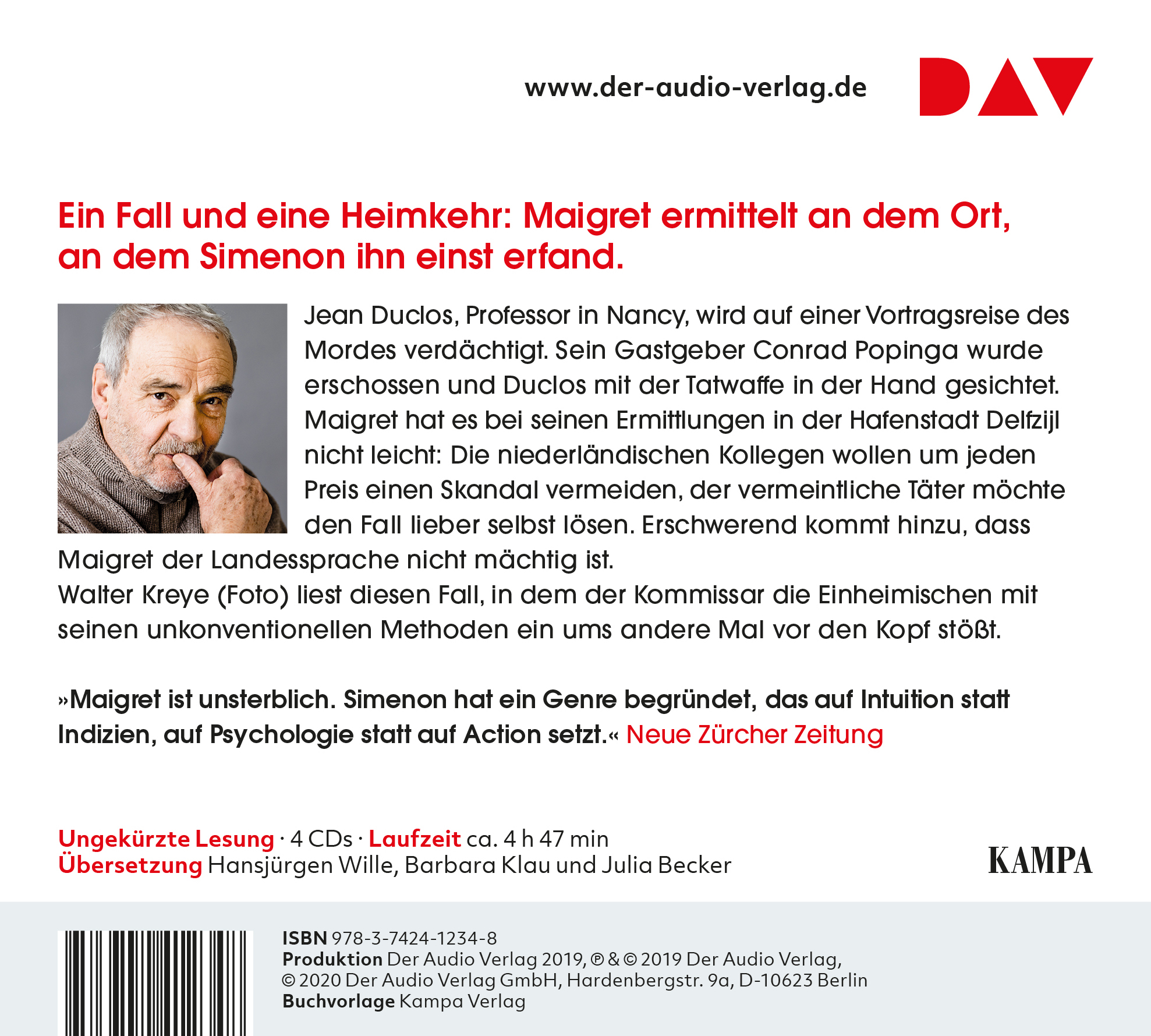 Walter Kreye, geboren 1942, spielte an Bühnen wie dem Hamburger Schauspielhaus, dem Thalia Theater, dem Staatstheater Stuttgart sowie an der Schaubühne Berlin. Der mit dem Grimme-Preis ausgezeichnete Schauspieler wurde durch zahlreiche Film- und Fernsehrollen bekannt, u. a. als Hauptkommissar Kress in »Der Alte« und durch die Netflix-Serie »Dark«. Der beliebte Hörbuchsprecher liest alle Fälle von Kommissar Maigret in der Edition Simenon ein.