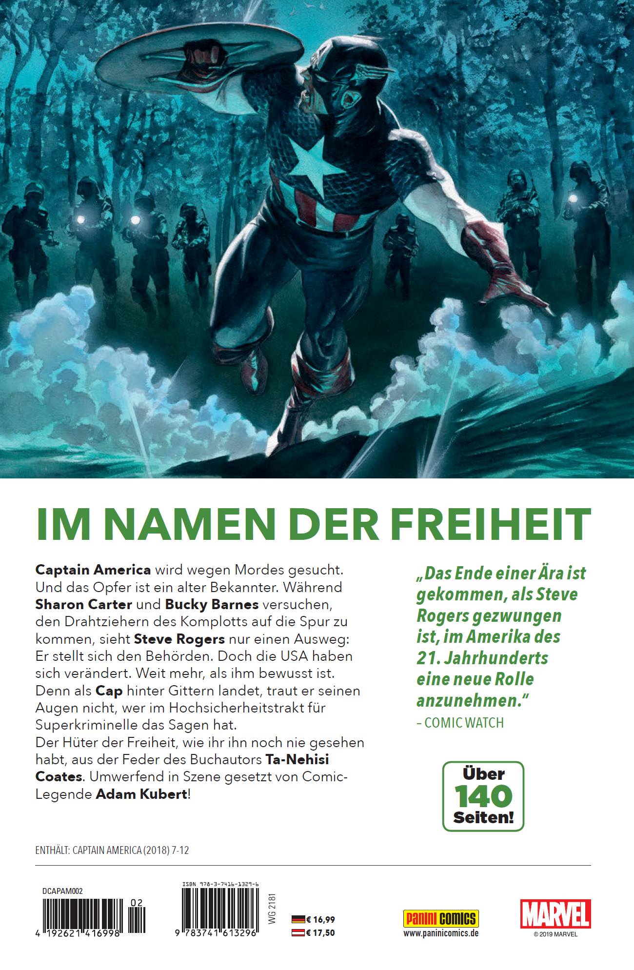 IM NAMEN DER FREIHEITCaptain America wird wegen Mordes gesucht. Und das Opfer ist ein alter Bekannter. Während Sharon Carter und Bucky Barnes versuchen, den Drahtziehern des Komplotts auf die Spur zu kommen, sieht Steve Rogers nur einen Ausweg: Er stellt sich den Behörden. Doch die USA haben sich verändert. Weit mehr, als ihm bewusst ist. Denn als Cap hinter Gittern landet, traut er seinen Augen nicht, wer im Hochsicherheitstrakt für Superkriminelle das Sagen hat.Der Hüter der Freiheit, wie ihr ihn noch nie gesehen habt, aus der Feder des Buchautors Ta-Nehisi Coates. Umwerfend in Szene gesetzt von Comic-Legende Adam Kubert!Enthält: Captain America(2018) #7-12