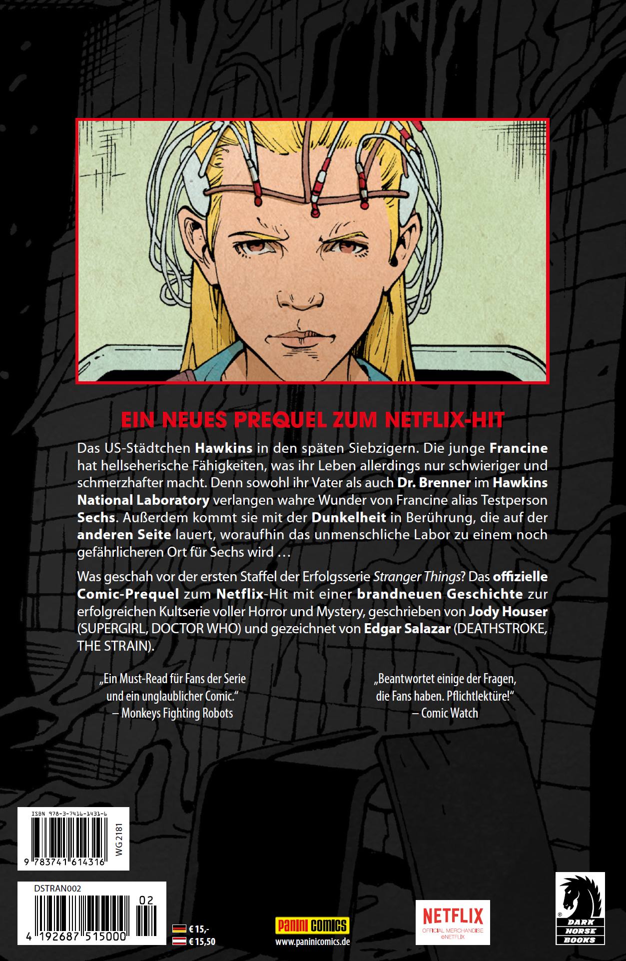 EIN NEUES PREQUEL ZUM NETFLIX-HITDas US-Städtchen Hawkins in den späten Siebzigern. Die junge Francine hat hellseherische Fähigkeiten, was ihr Leben allerdings nur schwieriger und schmerzhafter macht. Denn sowohl ihr Vater als auch Dr. Brenner im Hawkins National Laboratory verlangen wahre Wunder von Francine alias Testperson Sechs. Außerdem kommt sie mit der Dunkelheit in Berührung, die auf der anderen Seite lauert, woraufhin das unmenschliche Labor zu einem noch gefährlicheren Ort für Sechs wird ...Was geschah vor der ersten Staffel der Erfolgsserie Stranger Things? Das offizielle Comic-Prequel zum Netflix-Hit mit einer brandneuen Geschichte zur erfolgreichen Kultserie voller Horror und Mystery, geschrieben von Jody Houser (SUPERGIRL, DOCTOR WHO) und gezeichnet von Edgar Salazar (DEATHSTROKE, THE STRAIN).