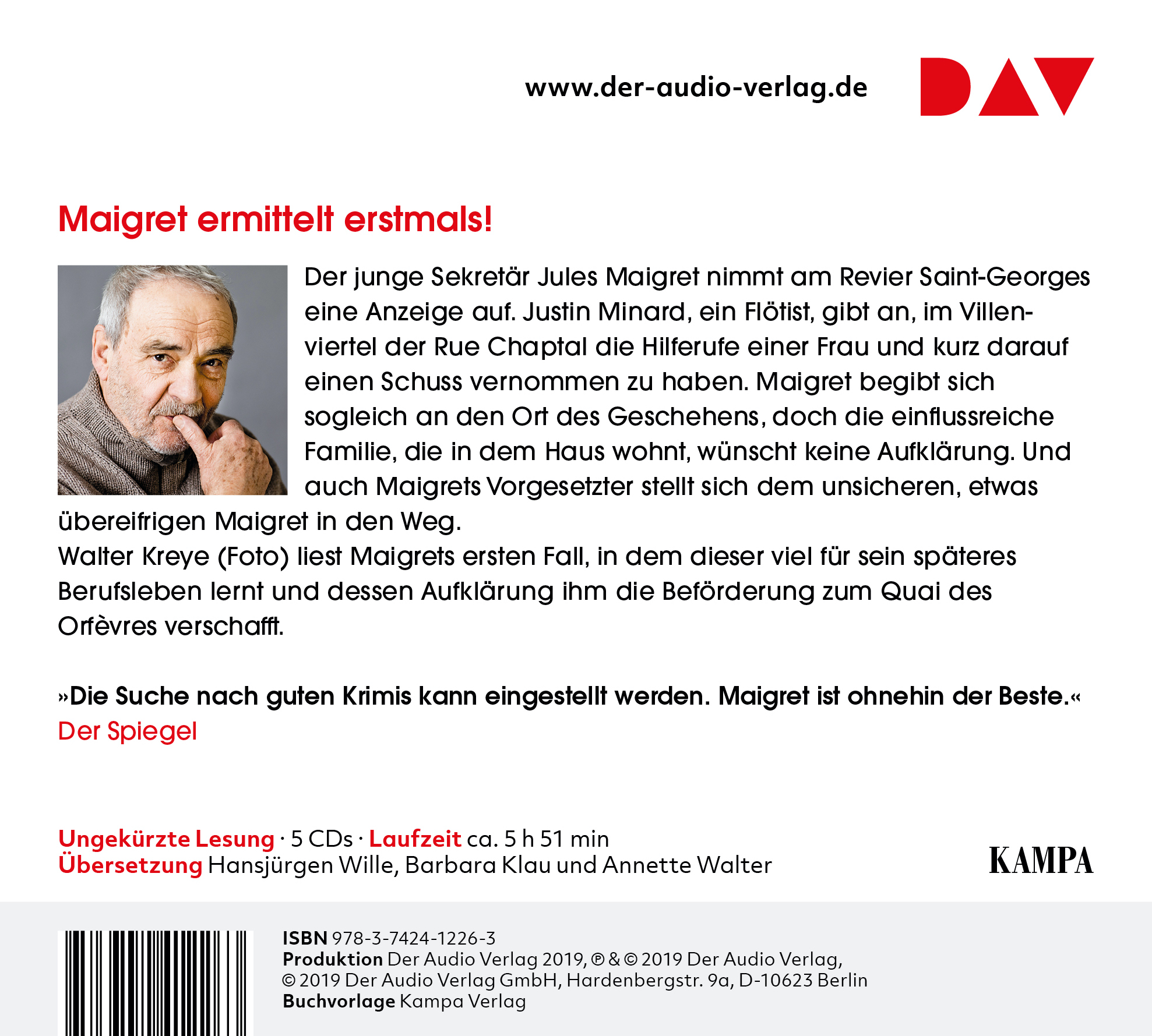 Walter Kreye wurde 1942 in Oldenburg als Sohn des Schriftstellers und Rundfunkredakteurs Walter Arthur Kreye geboren. Er spielte an bedeutenden Bühnen wie dem Hamburger Schauspielhaus, dem Thalia Theater, dem Staatstheater Stuttgart sowie an der Schaubühne Berlin. Einer breiten Öffentlichkeit wurde Kreye durch zahlreiche Rollen in Fernsehkrimis bekannt, u. a. im »Tatort« und durch seine Titelrolle in der erfolgreichen ZDF-Serie »Der Alte«. Für seine Leistung in der Fernsehserie »Reporter« erhielt er 1990 den Grimme-Preis. Außerdem war er in den Kinofilmen »Solo für Klarinette«, »Mondscheinkinder« und »Nichts als Gespenster« sowie in der Netflix-Serie »Dark« zu sehen. Der beliebte Hörbuchsprecher las Autoren wie Pascal Mercier, Håkan Nesser, Imre Kertész oder John le Carré ein. Walter Kreye liest alle Fälle von Kommissar Maigret in der Edition Simenon ein.