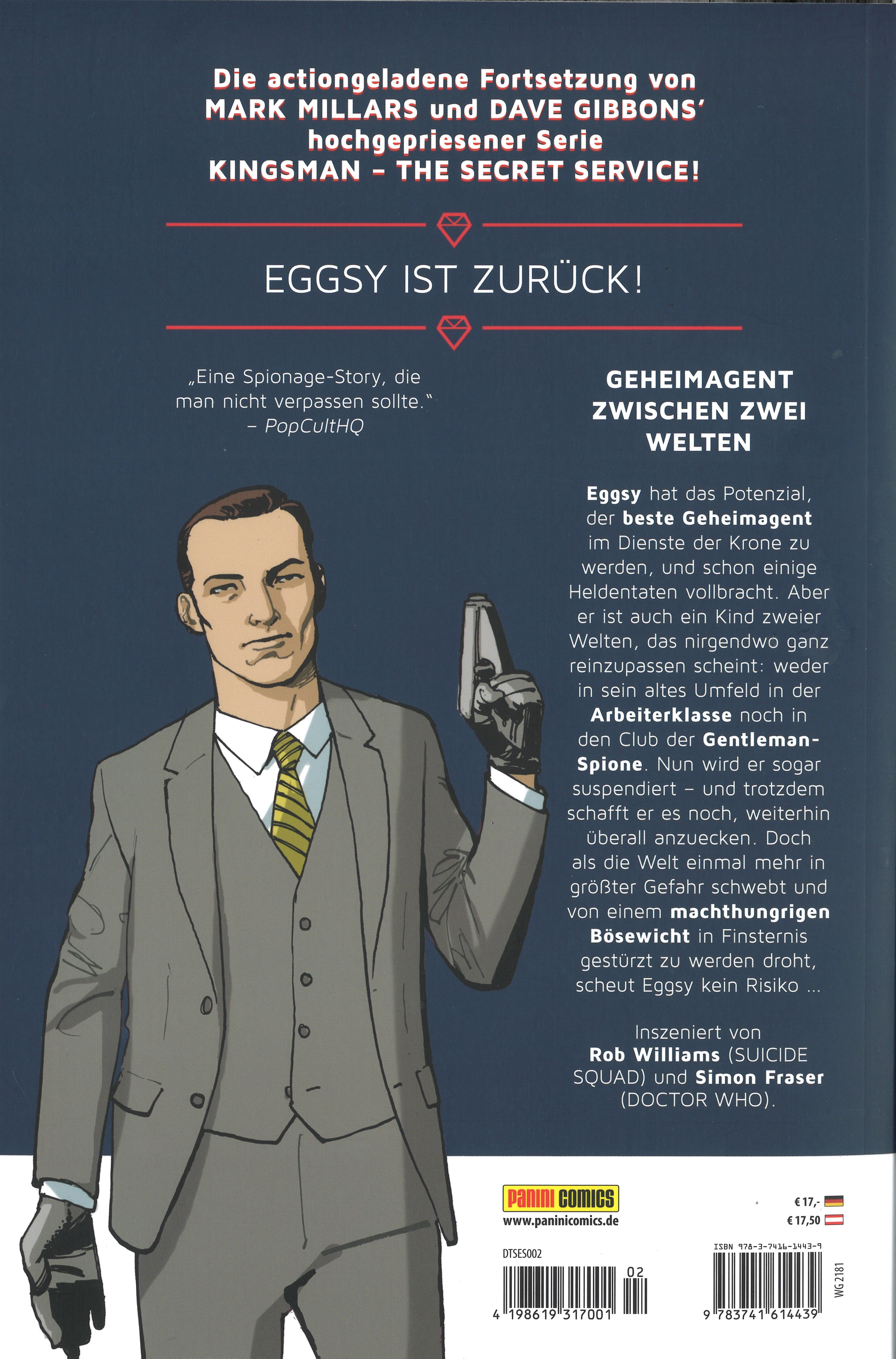 Die actiongeladene Fortsetzung von MARK MILLARS und DAVE GIBBONS' hochgepriesener Serie KINGSMAN - THE SECRET SERVICE!EGGSY IST ZURÜCK!GEHEIMAGENT ZWISCHEN ZWEI WELTENEggsy hat das Potenzial der beste Geheimagent im Dienste der Krone zu werden, und schon einige Heldentaten vollbracht. Aber er ist auch ein Kind zweier Welten, das nirgendwo ganz reinzupassen scheint: weder in sein altes Umfeld in der Arbeiterklasse noch in den Club der Gentleman-Spione. Nun wird er sogar suspendiert - und trotzdem schafft er es noch, weiterhin überall anzuecken. Doch als die Welt einmal mehr in größter Gefahr schwebt und von einem machthungrigen Bösewicht in Finsternis gestürzt zu werden droht, scheut Eggsy kein Risiko...Inszeniert von Rob Williams (SUICIDE SQUAD) und Simon Fraser (DOCTOR WHO).