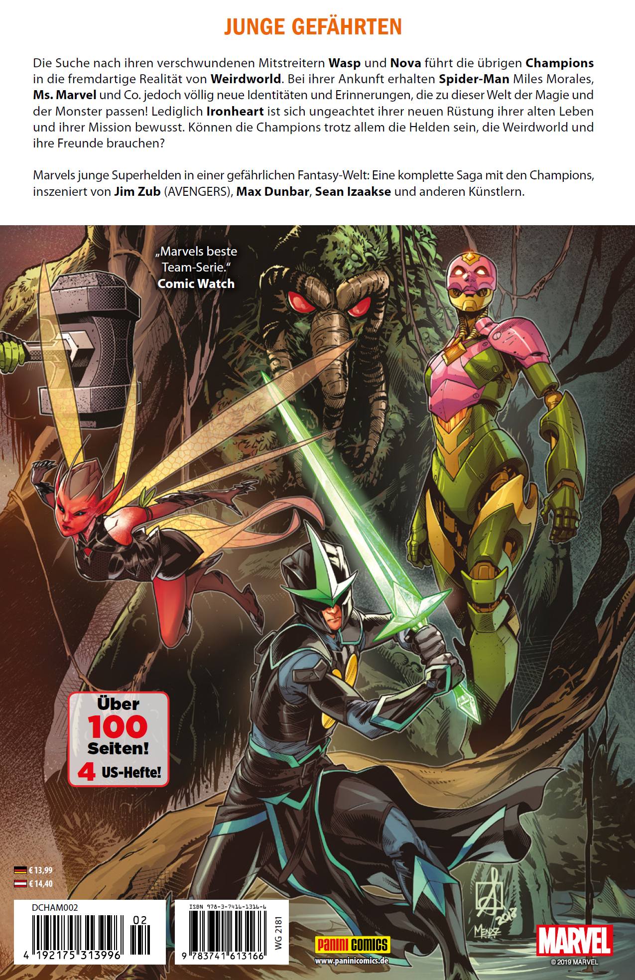 MÄCHTIGER NACHWUCHS von Christian EndresGemeinsam formen mehrere junge Heroen des Marvel-Universums das Champions-Team. Sie wollen die Dinge besser machen als ihre älteren Kollegen. Aktuell besteht das Team aus der Inhuman-Gestaltwandlerin Ms. Marvel Kamala Khan, Nachwuchsnetzschwinger Miles Morales, Nova Sam Alexander, dem ehemaligen Hulk Amadeus "Brawn" Cho, der neuen Wasp Nadia van Dyne, der Androidin Viv Vision (samt Robohund Sparky) und der genialen Rüstungsträgerin Riri "Ironheart" Williams. Bei einer Mission in Kanada schloss sich außerdem Amka "Snowguard" Aliyak der Truppe an, die es im INFINITY COUNTDOWN MEGABAND im All mit Thanos dem Titanen zu tun hatte - und in CHAMPIONS 1 in Afrika mit dem schurkischen Master of the World! Zudem prallten die Champions im ersten Band auf das Sumpfmonster Man-Thing, das auf Angst reagiert, eine Verbindung zum Nexus aller Realitäten hat und sogar teleportieren kann. Den Champions gelang es, Man-Things gefährliches Portal zu schließen - allerdings wurden Nadia und Sam, der seit einer Weltraummission seinen Helm und seine Kräfte verloren hat, zuvor ins Unbekannte gesogen ...