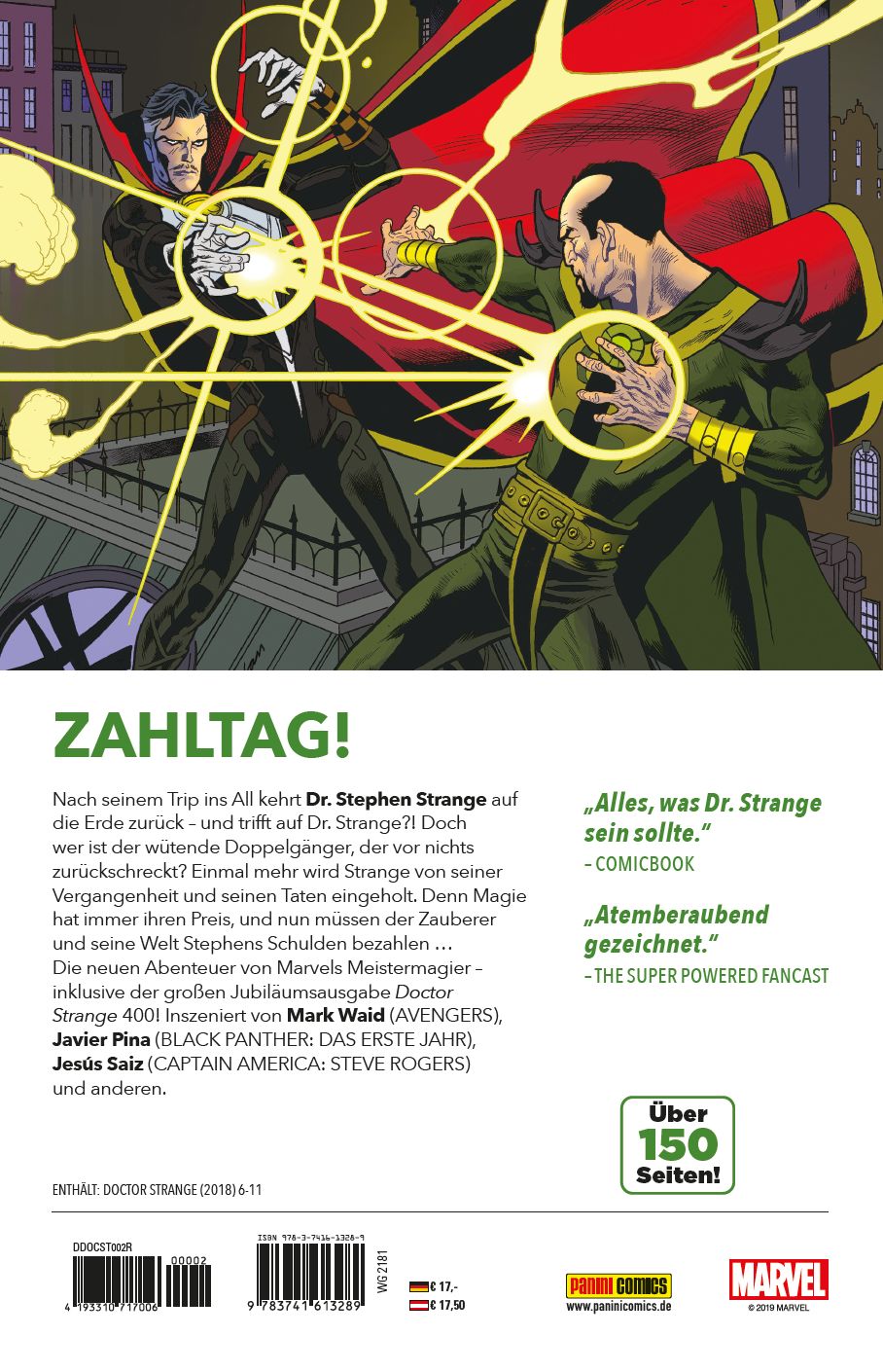 VORWORT von Christian EndresBei einem Autounfall wurden die Hände des erfolgreichen, aber arroganten Chirurgen Dr. Stephen Strange schwer beschädigt. Seine Suche nach Heilung führte Stephen um die ganze Welt. Im Himalaja-Gebirge traf er den Uralten, den Meister des Magischen und Mystischen, der Strange zum Zauberer ausbildete. Schließlich avancierte Stephen zum Obersten Zauberer, der die Erde vor dämonischen und anderen Gefahren aus fremden Dimensionen beschützt. In jüngerer Vergangenheit standen ihm Bibliothekarin Zelma, Geister-Beagle Bats und Kollegen wie Scarlet Witch und Dr. Voodoo bei - und natürlich sein langjähriger Diener und Freund Wong, mit dem Stephen sich jedoch überwarf. Darüber hinaus schienen sich die Zeiten, da Dr. Strange gegen seine Erzfeinde Baron Karl Mordo oder Dormammu kämpfte, zuletzt dem Ende entgegengeneigt zu haben. Stephen hatte die Verbindung zur geschwächten Magie der Erde verloren. Im ersten Band der aktuellen DOCTOR STRANGE-Serie des preisgekrönten Top-Autors Mark Waid brach Stephen deshalb mit einem Raumschiff von Tony Stark ins All auf, um mithilfe kosmischer Artefakte seine magische Macht wiederherzustellen. Auf seiner Reise zu den Sternen traf Strange die außerirdische Archäologin und Magieexpertin Kanna, die Zugang zu einer interdimensionalen Waffenschmiede hat. Nachdemer und Kanna die Erde vor der Vernichtung durch die Majesdane retteten, ist Dr. Strange nun bereit, auf seinen Heimatplaneten zurückzukehren. Was er nicht weiß: In seinem Sanctum Sanctorum im New Yorker Viertel Greenwich Village hält sich bereits ein Stephen Strange auf! Dieser sieht aus wie Stephen während seiner letzten Einsätze mit den Avengers und weiß, dass sich unser Dr. Strange aus dem All nähert. Was es mit dem doppelten Meistermagier auf sich hat, klären Mark Waid und Zeichner Javier Pina zu Beginn dieses Bandes. Zudem zelebrieren Waid, Zeichentalent Jesús Saiz und die Gastkünstler Kevin Nowlan, Butch Guice und Daniel Acuña in diesem Band 400 USSolohefte mit Marvels Oberstem Zauberer ...