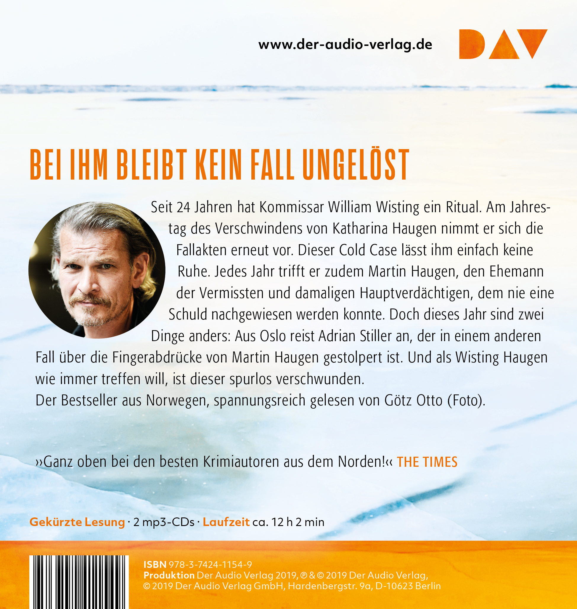 Götz Otto, 1967 geboren, stand auf zahlreichen großen Theaterbühnen. Einem breiten Publikum wurde er durch seine Rolle im James-Bond-Film »Der Morgen stirbt nie« bekannt. Für DAV liest er die Bestseller um den Polizeikommissar Wisting ein.