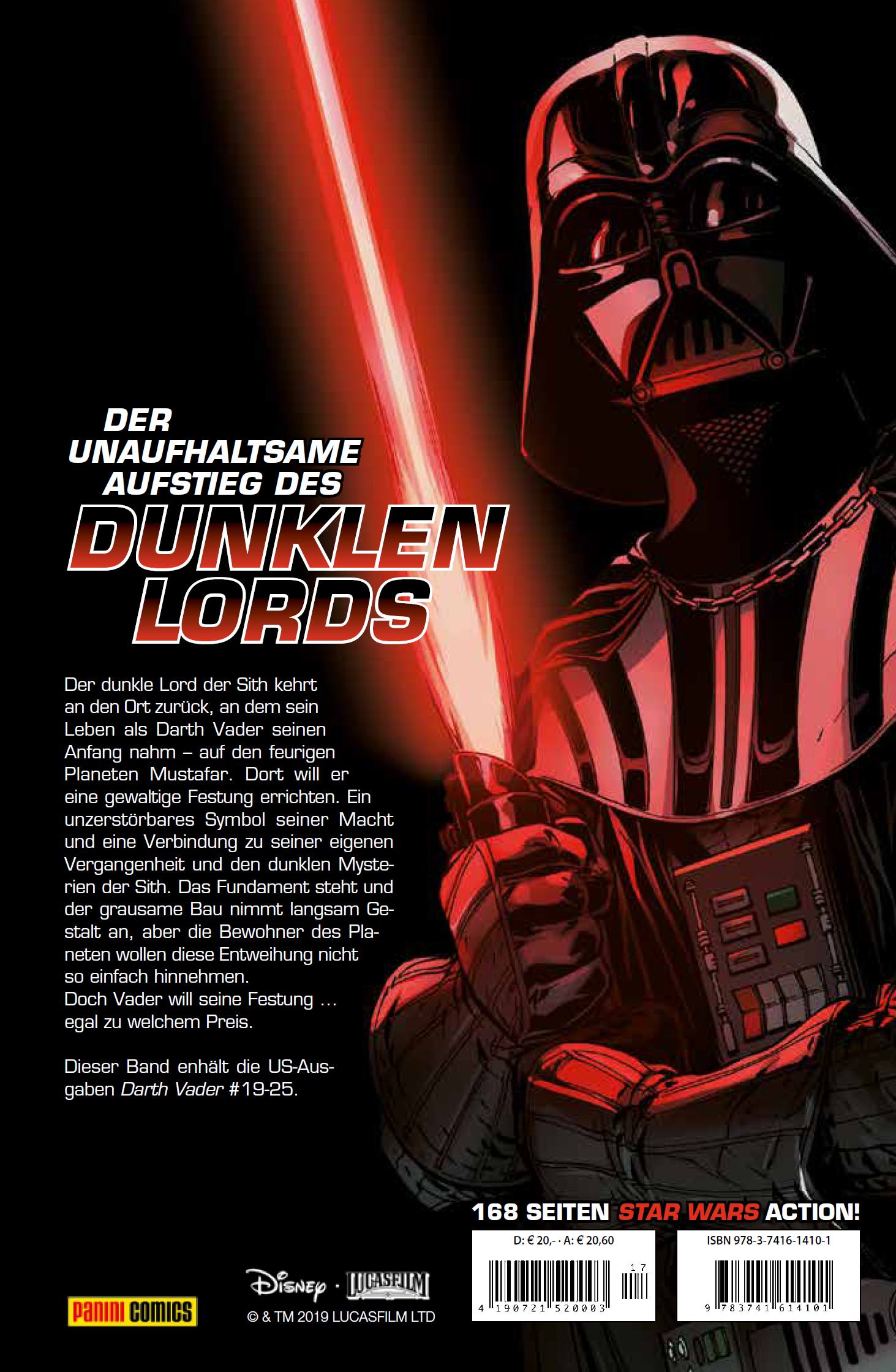 DER UNAUFHALTSAME AUFSTIEG DES DUNKLEN LORDSDer dunkle Lord der Sith kehrt an den Ort zurück, an dem sein Leben als Darth Vader seinen Anfang nahm - auf den feurigen Planeten Mustafar. Dort will er eine gewaltige Festung errichten. Ein unzerstörbares Symbol seiner Macht und eine Verbindung zu seiner eigenen Vergangenheit und den dunklen Mysterien der Sith. Das Fundament steht und der grausame Bau nimmt langsam Gestalt an, aber die Bewohner des Planeten wollen diese Entweihung nicht so einfach hinnehmen. Doch Vader will seine Festung ... egal zu welchem Preis.Dieser Band enhält die US-Ausgaben Darth Vader #19-25.