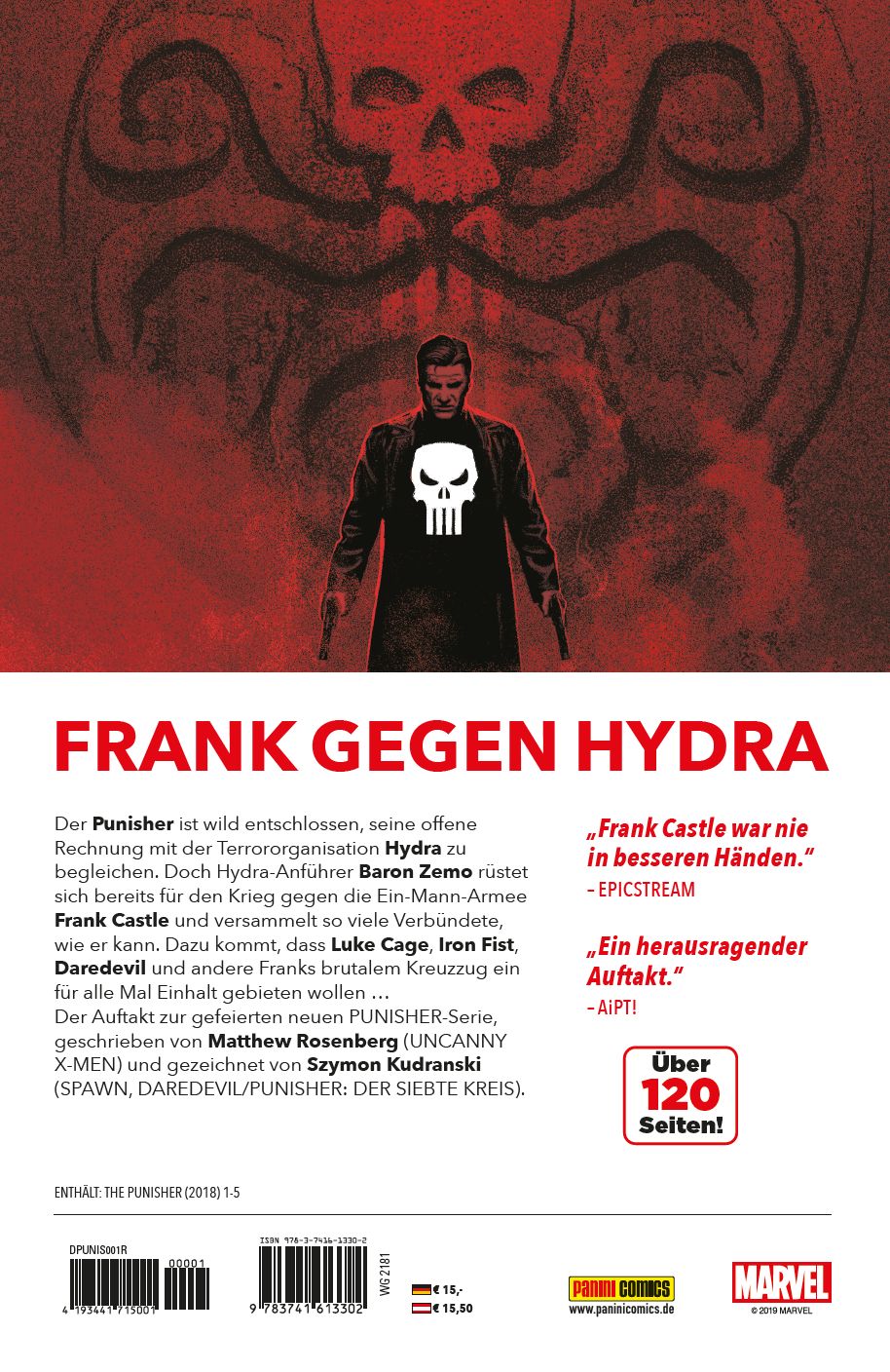 FRANK GEGEN HYDRADer Punisher ist wild entschlossen, seine offene Rechnung mit der Terrororganisation Hydra zu begleichen. Doch Hydra-Anführer Baron Zemo rüstet sich bereits für den Krieg gegen die Ein-Mann-Armee Frank Castle und versammelt so viele Verbündete, wie er kann. Dazu kommt, dass Luke Cage, Iron Fist, Daredevil und andere Franks brutalem Kreuzzug ein für allemal Einhalt gebieten wollen ...Der Auftakt zur gefeierten neuen PUNISHER-Serie, geschrieben von Matthew Rosenberg (UNCANNY X-MEN) und gezeichnet von Szymon Kudranski (SPAWN, DAREDEVIL/PUNISHER: DER SIEBTE KREIS).ENTHÄLT: THE PUNISHER (2018) 1-5