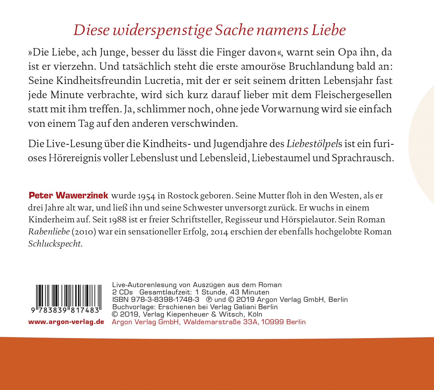 Peter Wawerzinek wurde 1954 unter dem Namen Peter Runkel geboren. Er wuchs in verschiedenen Heimen und bei verschiedenen Pflegeeltern auf. Seit 1988 freier Schriftsteller, Regisseur und Hörspielautor. Sein Roman "Rabenliebe" (2010) war ein sensationeller Erfolg, 2014 legte er mit "Schluckspecht" nach. 2016 war Wawerzinek Dresdner Stadtschreiber.