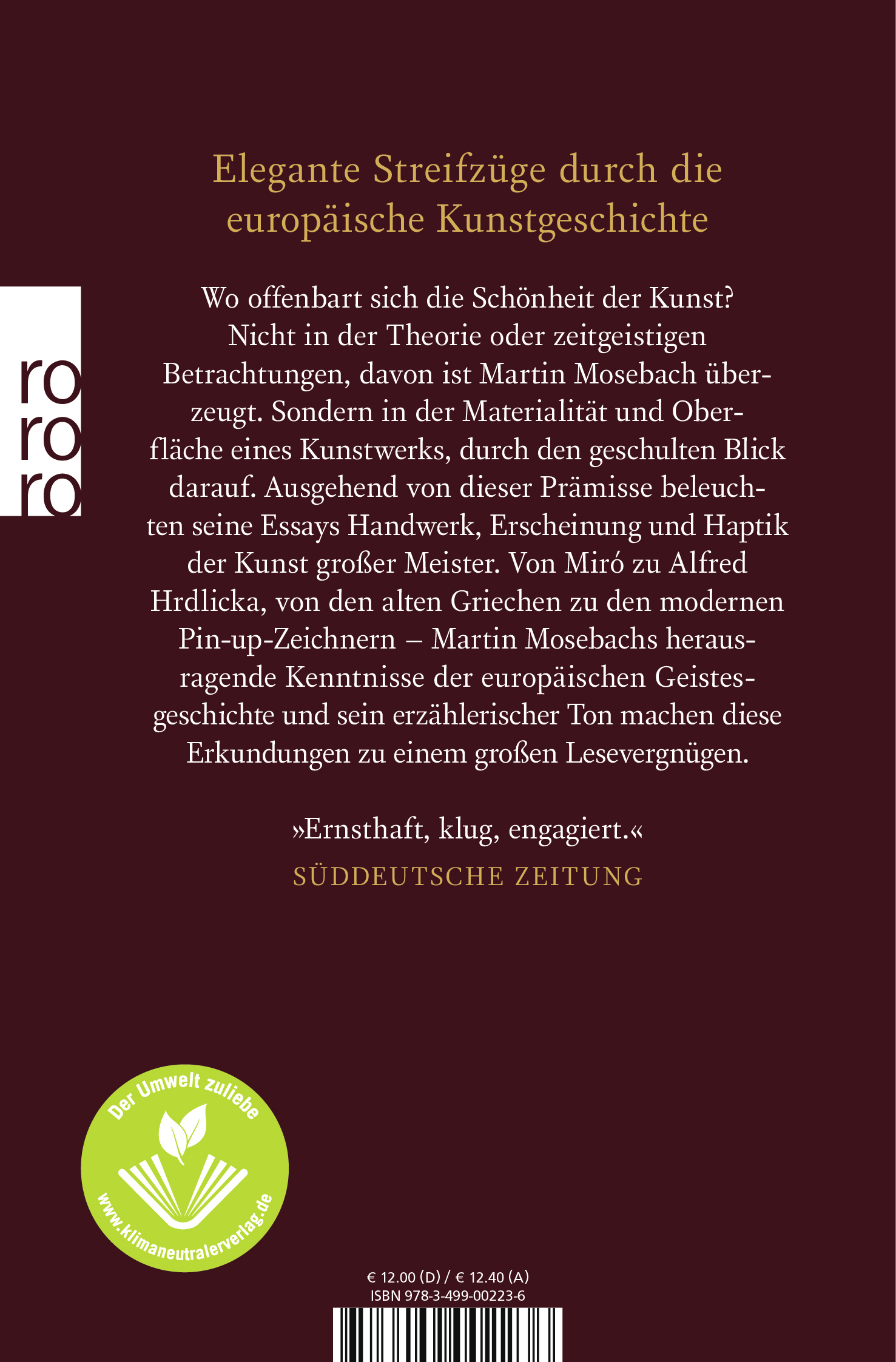 Mosebachs Blick bleibt dabei der eines Schriftstellers: So entstehen um die Kunst herum Erzählungen, die von der Oberfläche abschweifen und wieder zu ihr zurückkehren.