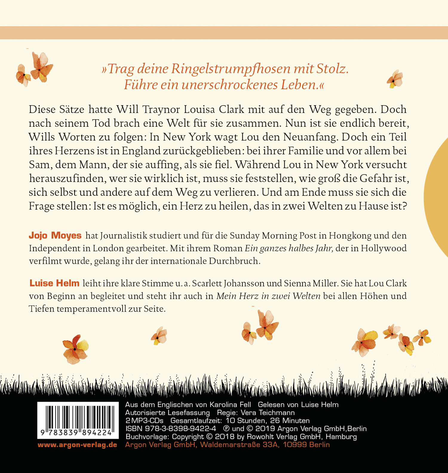 Luise Helm hat Lou Clark von Beginn an begleitet. Die versierte Hörbuch- und Synchronsprecherin hat bisher jeden Roman von Jojo Moyes als Hörbuch eingelesen. Auch in "Mein Herz in zwei Welten" wird sie Lou bei allen Höhen und Tiefen klang- und temperamentvoll zur Seite stehen.