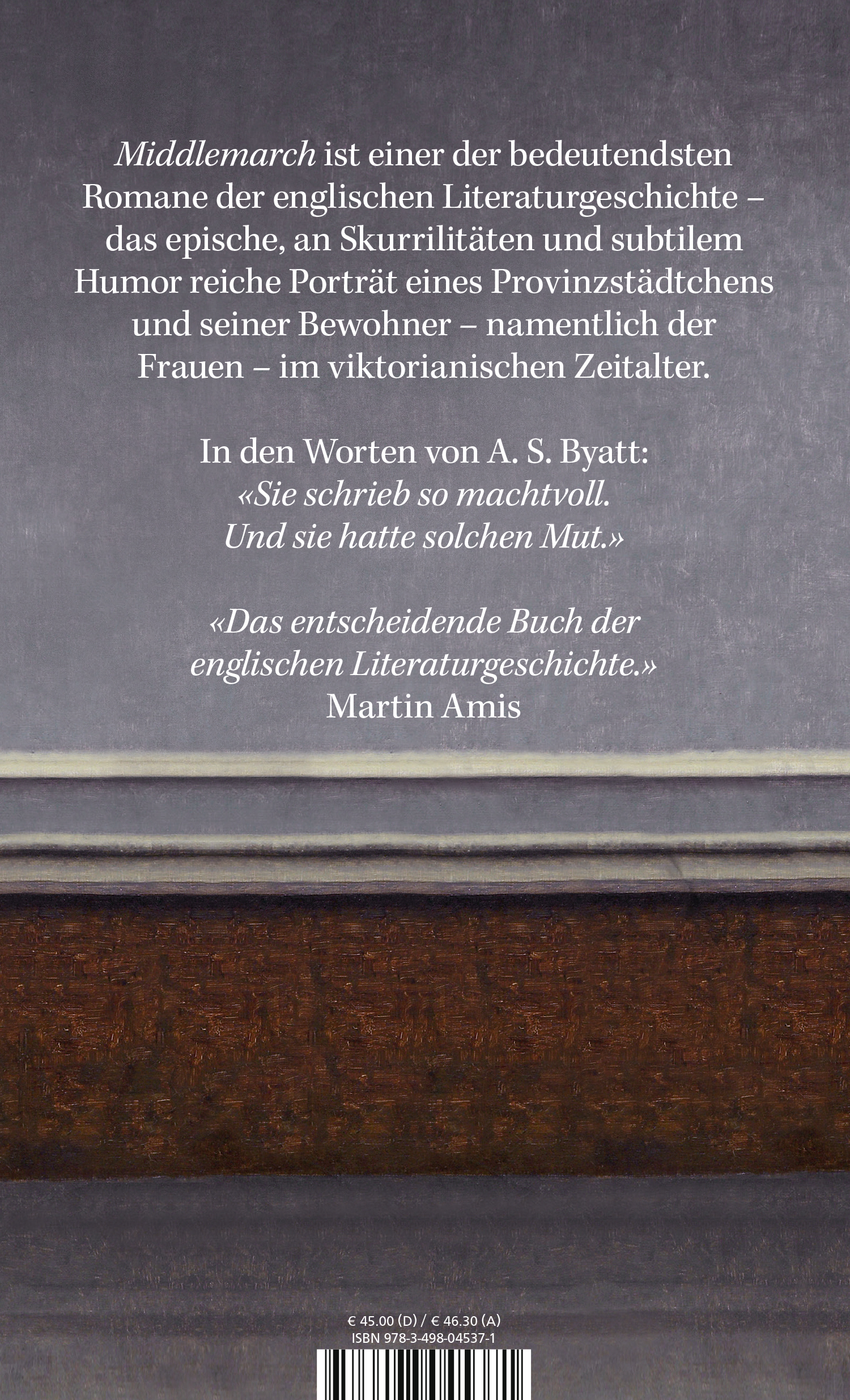 "Middlemarch", der berühmteste Roman von Mary Ann Evans, die unter dem männlichen Pseudonym George Eliot auftrat, um als schreibende Frau wahrgenommen zu werden, gilt bis heute zu Recht als Höhepunkt englischer Romankunst des 19. Jahrhunderts; seine Mischung aus Realismus, farbiger Personenzeichnung, psychologischer Einfühlung, naturwissenschaftlichem und philosophischem Interesse und historischem und sozialgeschichtlichem Bewusstsein ist unerreicht. Das Buch zeichnet ein lebhaftes Gemälde von den Skurrilitäten der englischen Provinz und ihrer Bewohner. Es ist mit scheinbar leichter Hand geschrieben, in einem Stil, den eine verhaltene, doch stets präsente elegante Ironie prägt, wie sie ähnlich vollendet in der englischen Literatur vielleicht am ehesten Jane Austen ein halbes Jahrhundert vor George Eliot zu Gebote stand. Für Virginia Woolf war es „das herrliche Buch" schlechthin.