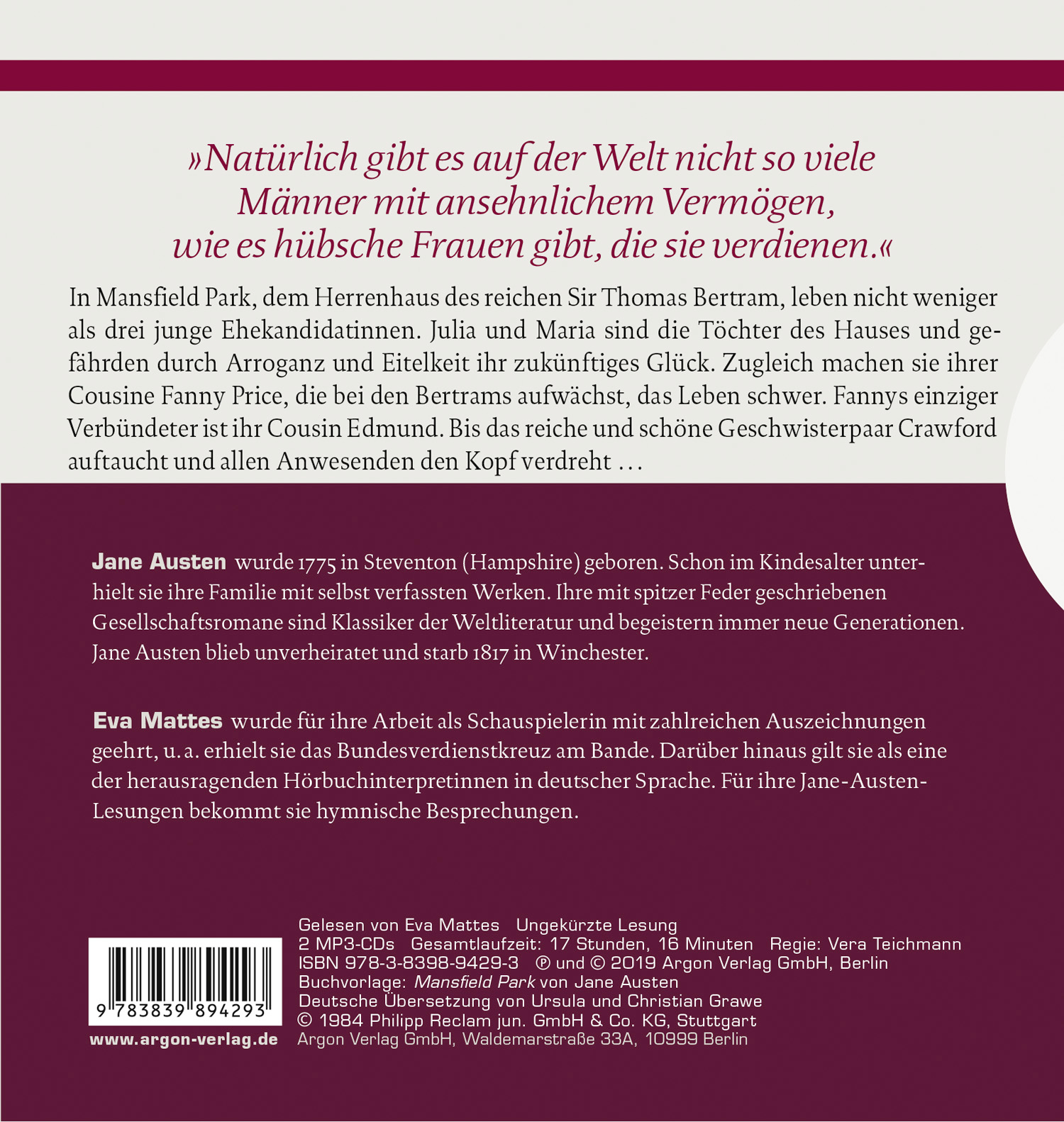 lt;p>In Mansfield Park, dem Herrenhaus des reichen Sir Thomas Bertram, leben nicht weniger als drei junge Ehekandidatinnen. Julia und Maria sind die beiden Töchter des Hauses und gefährden durch Arroganz und Eitelkeit ihr zukünftiges Glück. Zugleich machen sie ihrer armen Verwandten Fanny Price, die bei den Bertrams aufwächst, das Leben schwer. Fannys einziger Verbündeter ist ihr Cousin Edmund. Bis das reiche und schöne Geschwisterpaar Crawford auftaucht und allen Anwesenden den Kopf verdreht ...