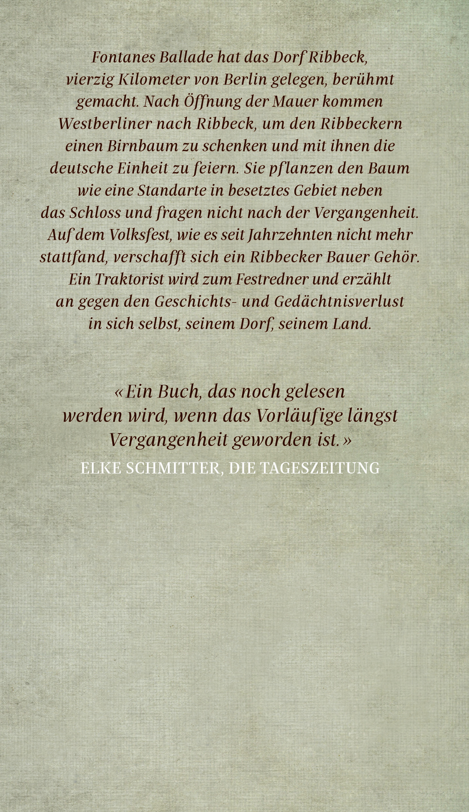 Auf dem Volksfest, wie es seit Jahrzehnten nicht mehr stattfand, mit Erbsensuppe, Freibier und Birnenschnaps aus dem Westen, verschafft sich ein Ribbecker Bauer Gehör. Zögernd zuerst erzählt er die Geschichte des Dorfes an der alten Heerstraße, erzählt von Feudalherren, Nazis und Soldaten im Zweiten Weltkrieg, den Etappen des Sozialismus bis zum Niedergang der Landwirtschaft. Er erzählt von den Herren im Dorf, dem letzten Ribbeck, der in das KZ Sachsenhausen kam, von der Roten Armee, den Parteibonzen und den Erben, die jetzt wieder das Dorf mit herrischen Schritten vermessen. Ein «Festredner», der gehört werden will und anerzählt gegen den Geschichts- und Gedächtnisverlust in sich selbst, seinem Dorf, seinem Land.