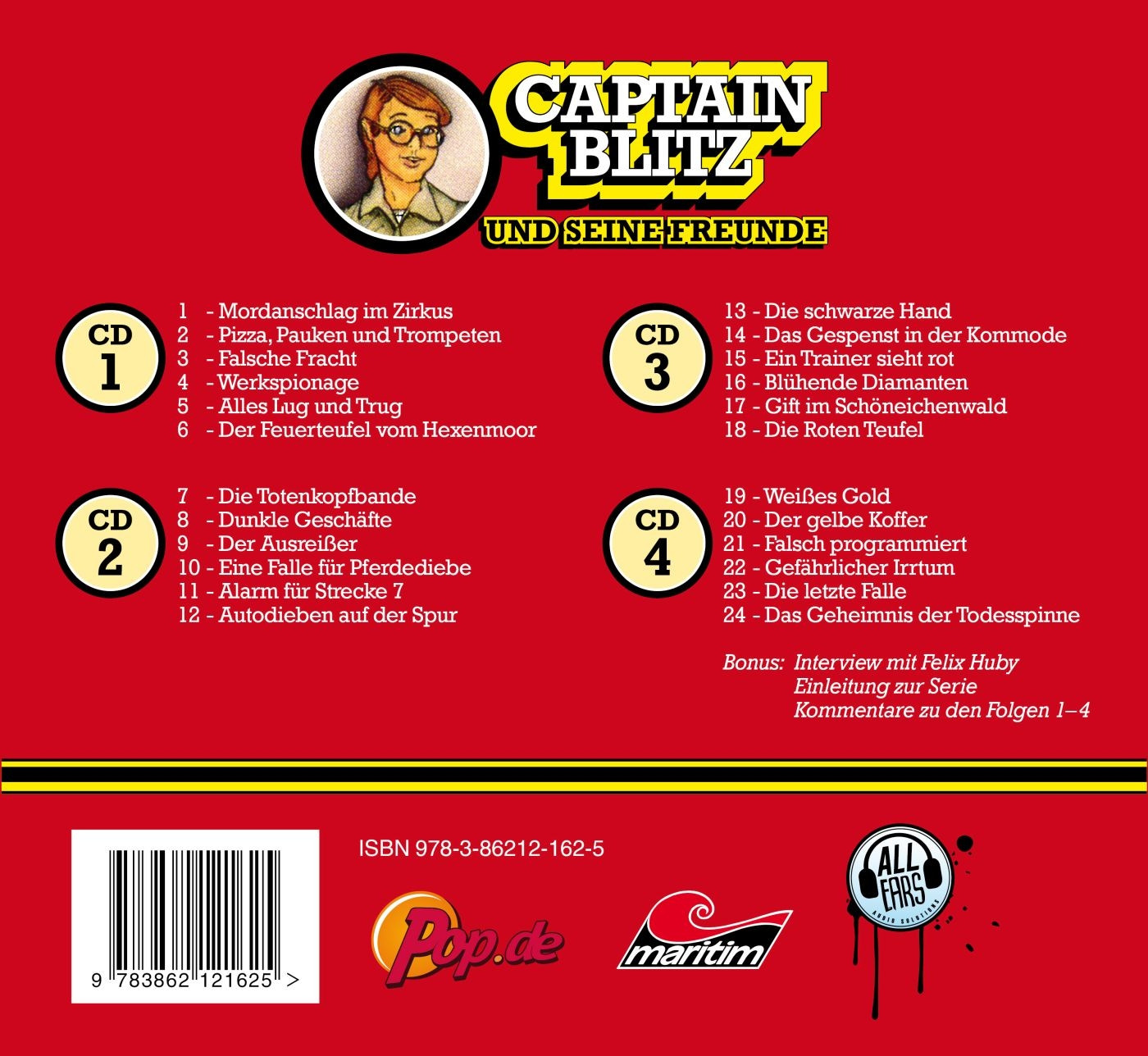 Alle 24 Folgen der Serie "Captain Blitz und seine Freunde" in einer Box. Zusätzlich exklusive Bonusmaterial mit Felix Huby. Hallo, Leute! Ich bin Hans-Peter Bergmann, aber meine Freunde nennen mich Captain Blitz. Und meine Freunde, das sind Anke, Pacco und mein kleiner Bruder Matti. Zusammen sind wir eine unschlagbare Detektiv-Truppe. Was wir schon für "Fälle" gelöst haben, ich kann euch sagen! Einer spannender als der andere. Da müßt ihr einfach reinhören!