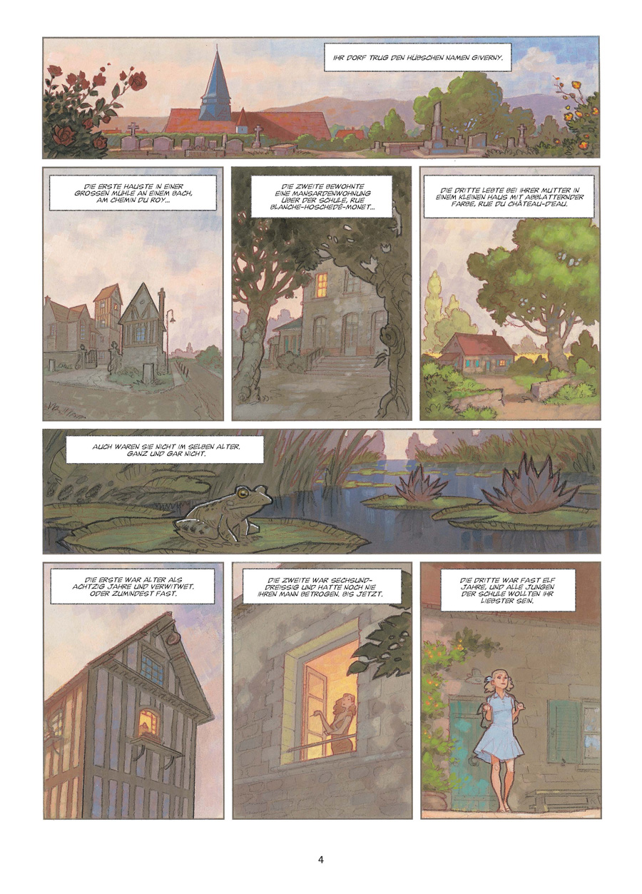 Das Dorf Giverny ist im wahrsten Sinne des Wortes die malerischste Ecke der Normandie, denn seine Gärten inspirierten Claude Monet zu einigen seiner schönsten Werke. Doch die Vergangenheit von Giverny ist weniger idyllisch, als seine Bewohner zugeben wollen, und plötzlich erschüttert ein Mordfall die Gemeinde. Drei Frauen kreuzen den Weg des Ermittlers, der mit der Aufklärung des Falls beauftragt wurde: eine junge Malerin, eine verführerische Lehrerin und eine misstrauische Alte, die sich in ihrem Haus verschanzt hat. Aber welche kennt das Geheimnis der schwarzen Seerosen, jenes weltberühmten Gemäldes, das nach dem Mord spurlos verschwunden ist? Fred Duval und Didier Cassegrain adaptieren den Roman von Michel Bussi (»Das Mädchen mit den blauen Augen«) als eindringliche Kriminalgeschichte voller falscher Fährten und in impressionistischen Bildern, die einfach zum Schwelgen einladen.