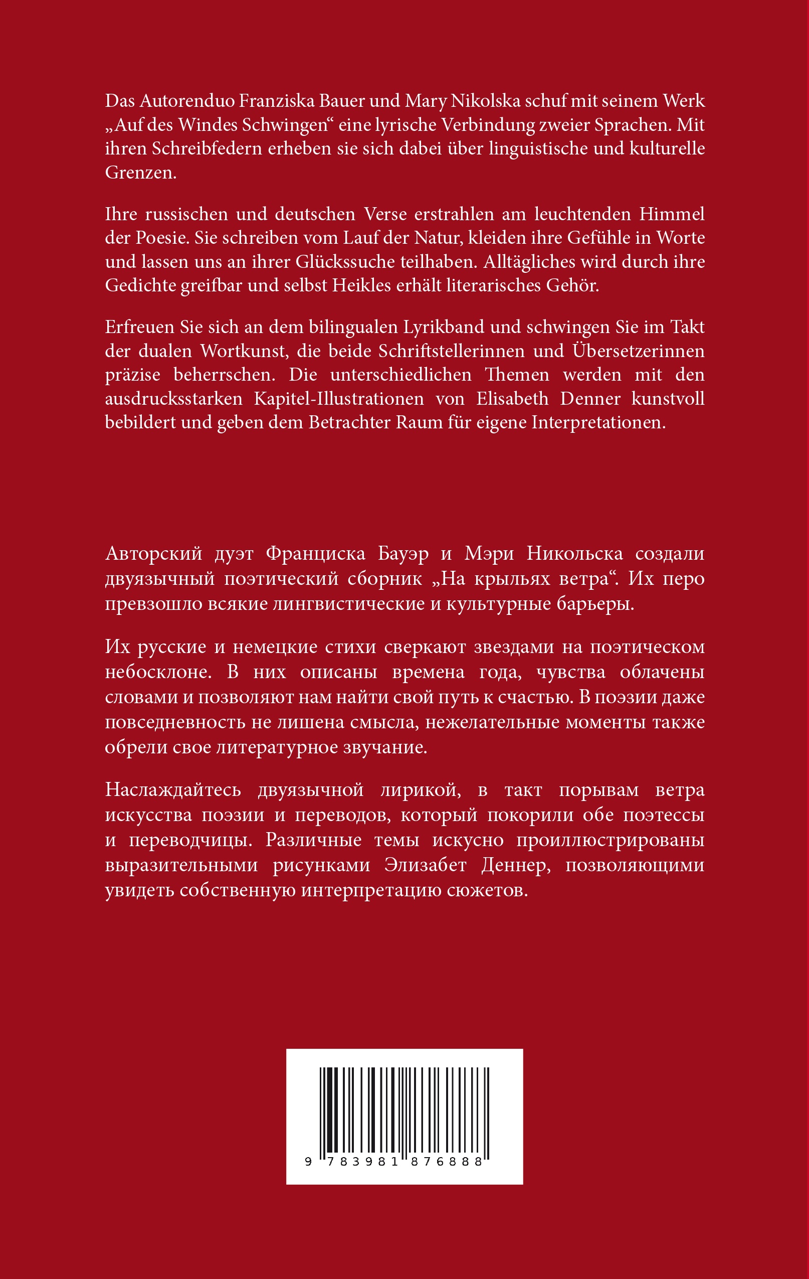 Их русские и немецкие стихи сверкают звездами на поэтическом небосклоне. В них описаны времена года, чувства облачены словами и позволяют нам найти свой путь к счастью. В поэзии даже повседневность не лишена смысла, нежелательные моменты также обрели свое литературное звучание.