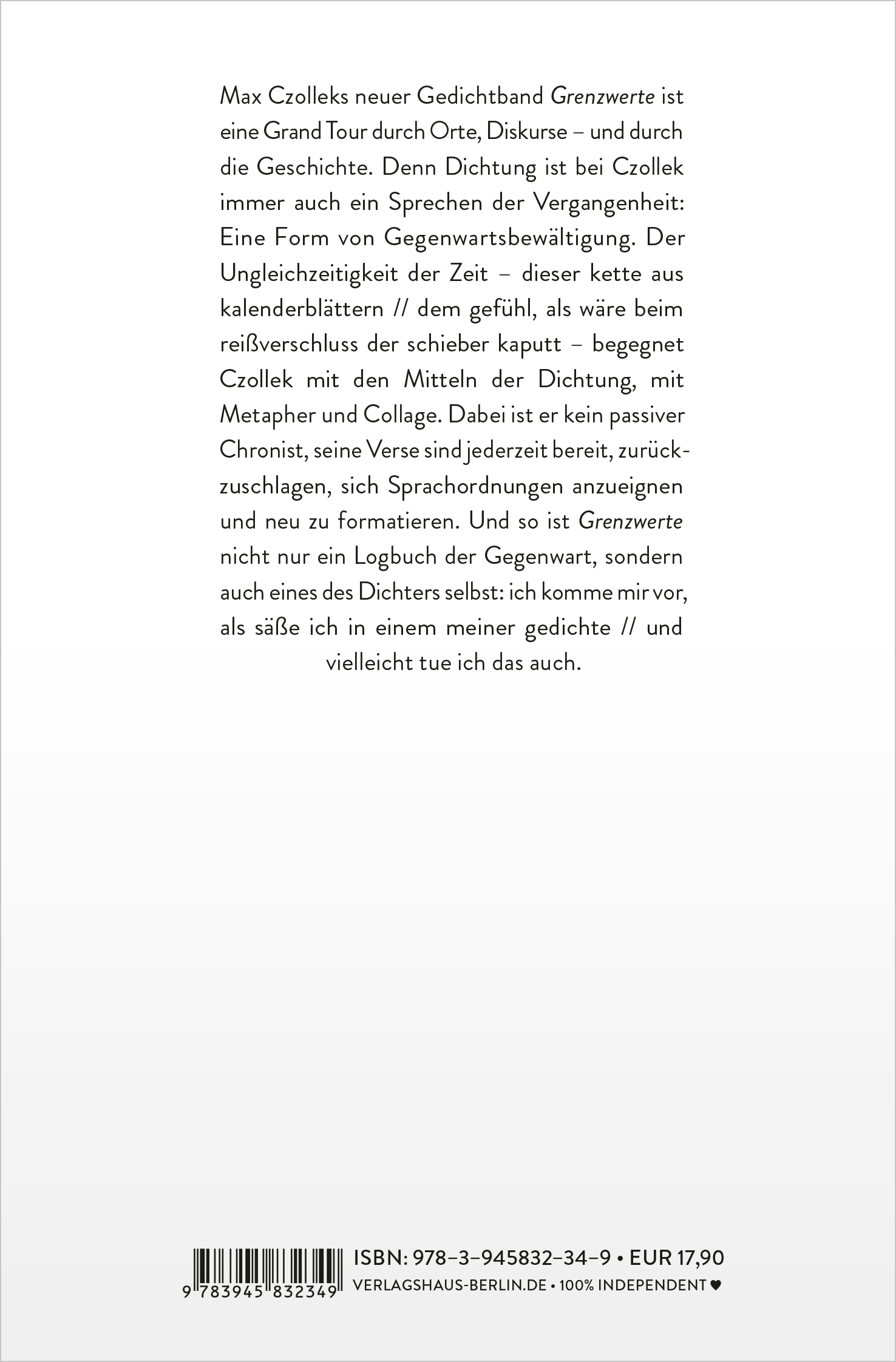 Max Czolleks neuer Gedichtband Grenzwerte ist eine Grand Tour durch Orte, Diskurse - und durch die Geschichte. Denn Dichtung ist bei Czollek immer auch ein Sprechen der Vergangenheit: Eine Form von Gegenwartsbewältigung. Der Ungleichzeitigkeit der Zeit - dieser kette aus kalenderblättern / dem gefühl, als wäre beim reißverschluss der schieber kaputt - begegnet Czollek mit den Mitteln der Dichtung, mit Metapher und Collage. Dabei ist er kein passiver Chronist, seine Verse sind jederzeit bereit, zurückzuschlagen, sich Sprachordnungen anzueignen und neu zu formatieren. Und so ist Grenzwerte nicht nur ein Logbuch der Gegenwart, sondern auch eines des Dichters selbst: ich komme mir vor, als säße ich in einem meiner gedichte / und vielleicht tue ich das auch.