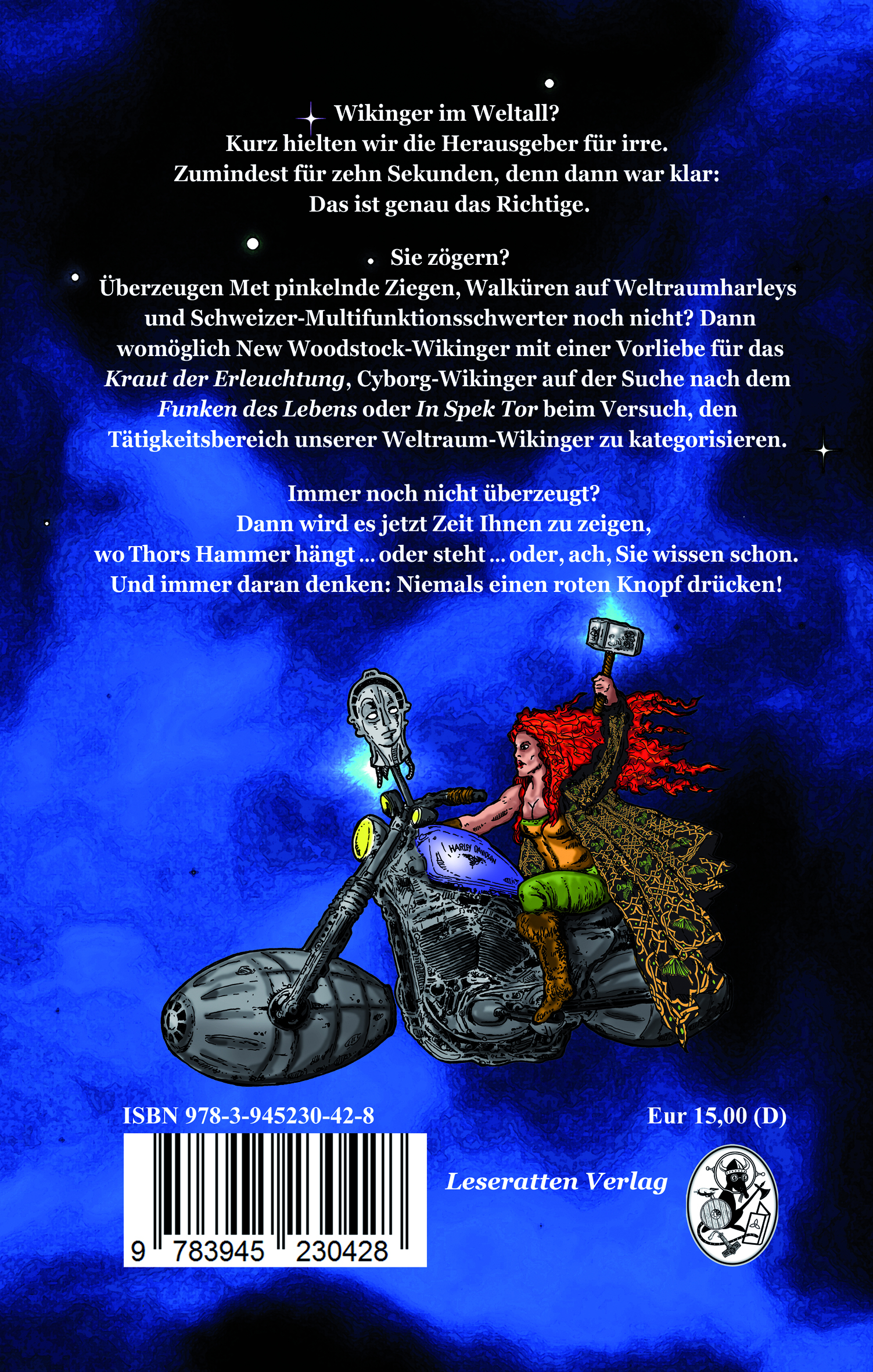 Die jährliche Anthologie aus dem Leseratten Verlag heißt 2019 "Vikings of the Galaxy". Gesucht wurde im deutschsprachigen Raum der möglichst wahnwitzigste Irrsinn, den Wikinger im Weltall so verbreiten können. 20 Autoren liefern genau das: Funtastische Geschichten für die metgeschmierten Lachmuskeln.