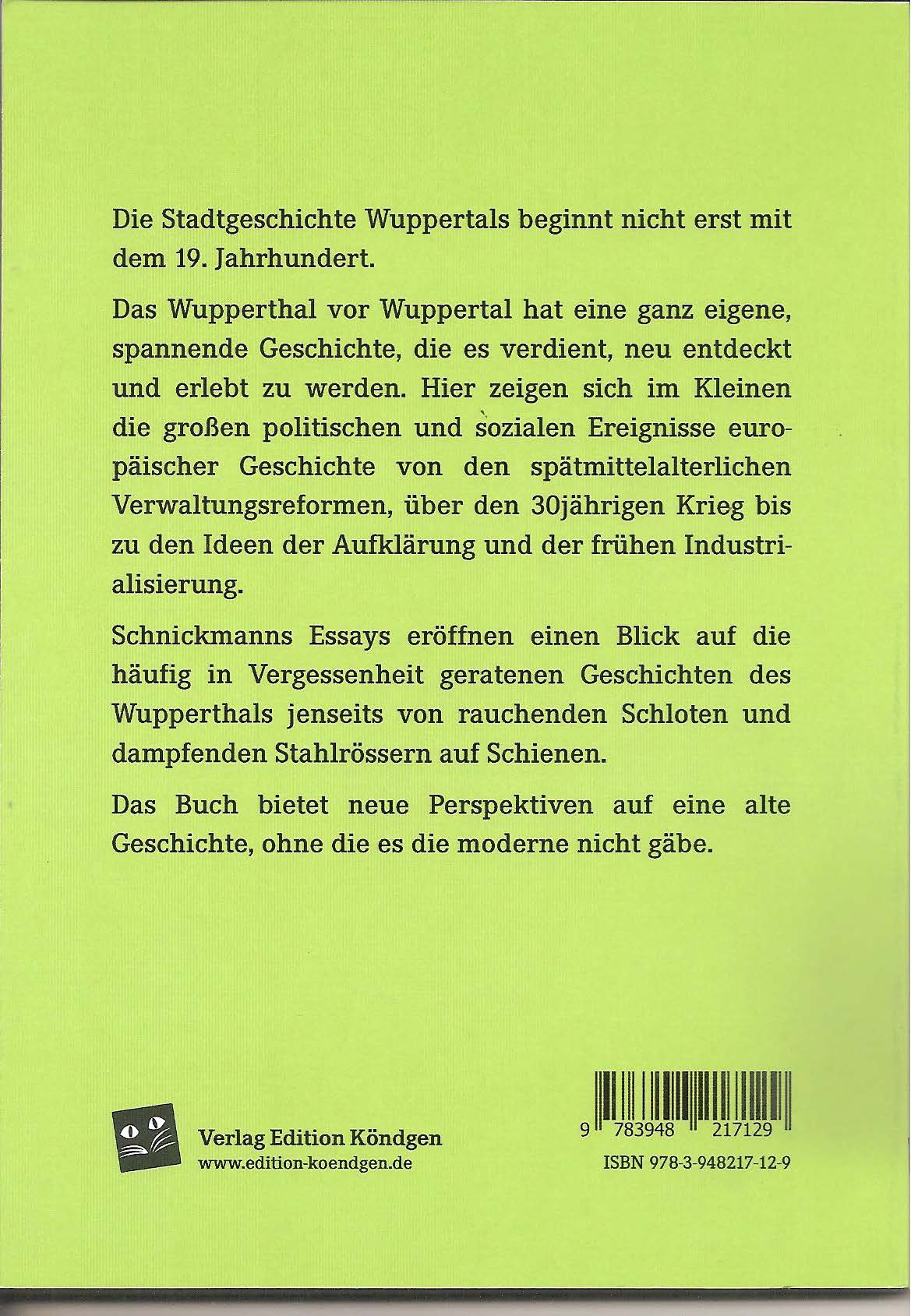 Die Stadtgeschichte Wuppertals beginnt nicht erst mit dem 19. Jahrhundert.Das Wupperthal vor Wuppertal hat eine ganz eigene, spannende Geschichte, die es verdient, neu entdecktund erlebt zu werden. Hier zeigen sich im Kleinen die großen politischen und sozialen Ereignisse europäischerGeschichte von den spätmittelalterlichen Verwaltungsreformen, über den 30jährigen Krieg bis zu den Ideen der Aufklärung und der frühen Industrialisierung.Schnickmanns Essays eröffnen einen Blick auf die häufig in Vergessenheit geratenen Geschichten desWupperthals jenseits von rauchenden Schloten und dampfenden Stahlrössern auf Schienen.Das Buch bietet neue Perspektiven auf eine alte Geschichte, ohne die es die moderne nicht gäbe.