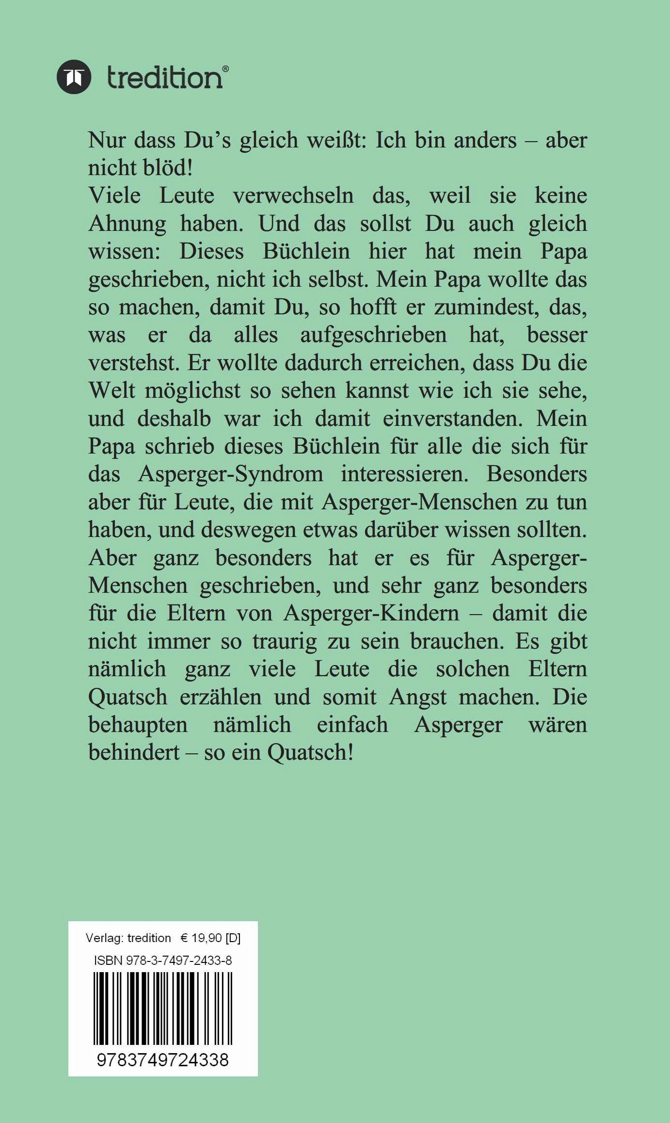 | Schlagworte | Asperger • ASPERGER-Autismus • Autist • Tatsachenbericht • wahreBegebenheit • Wahre Begebenheit |