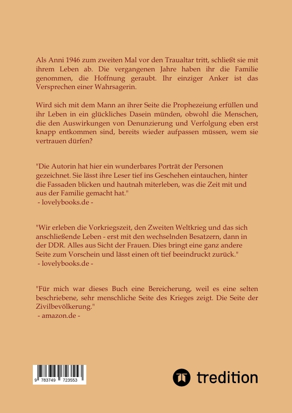 | Schlagworte | Biografie • Biographie • Deutsche Geschichte • DeutscheGeschichte • Die Stärke der Frau • DieStärkederFrau • Erzählendes Sachbuch • ErzählendesSachbuch • Familienroman • Flucht und Vertreibung • FluchtundVertreibung • Frauen im 2.Weltkrieg • Frauenim2.Weltkrieg • Frauen in Ostdeutschland • FraueninOstdeutschland • Frauenschicksale • Generationenkonflikt • Geschichte 2.Weltkrieg • Geschichte2.Weltkrieg • Geschichte DDR • GeschichteDDR • Geschichte Ostdeutschlands • GeschichteOstdeutschlands • Heimatvertriebene • Kriegsenkel • Kriegskinder • Lebensgeschichte • Lebenslauf • Lebensläufe • LPG in Ostdeutschland • LPGinOstdeutschland • Roman |