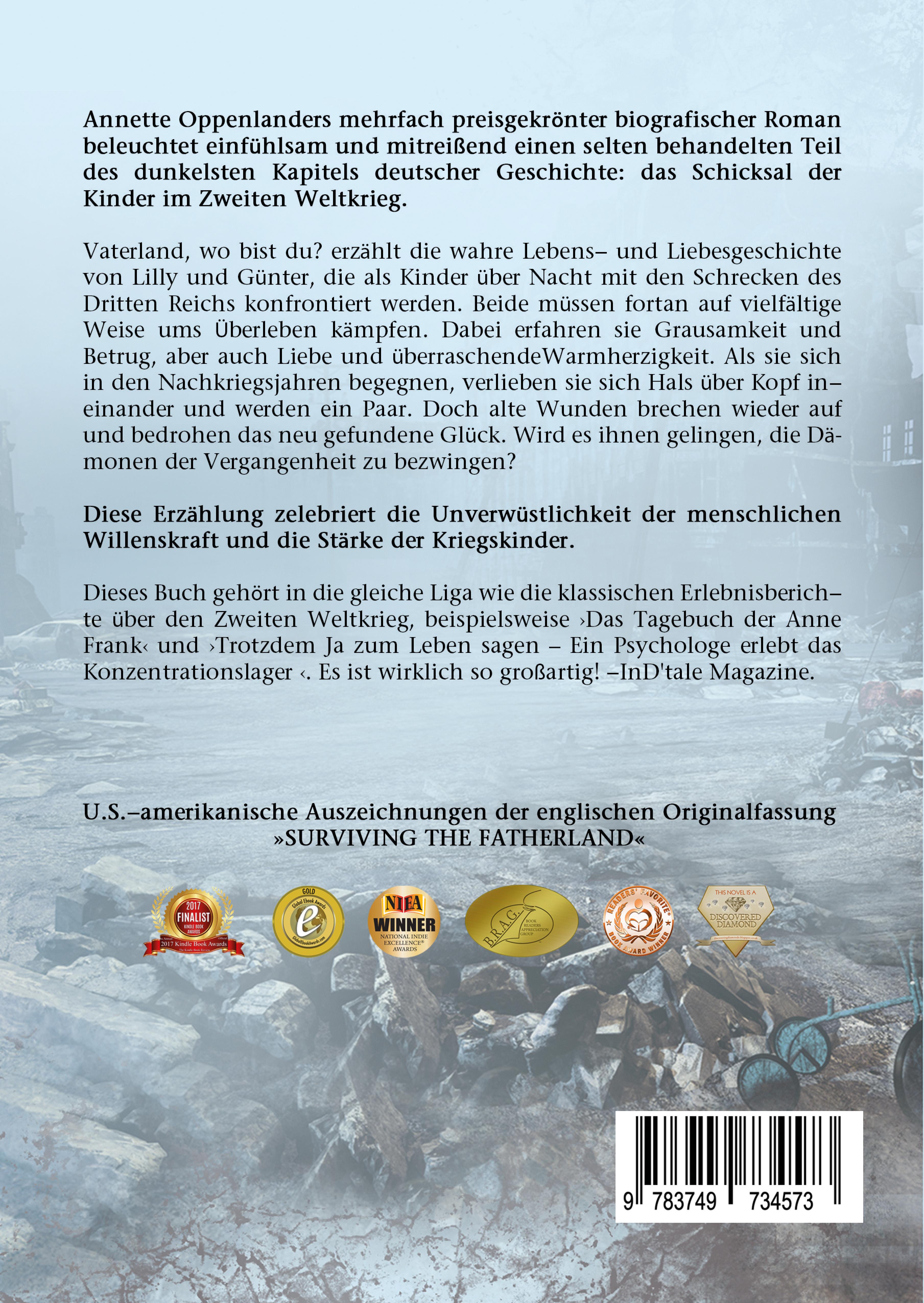 Annette Oppenlanders mehrfach preisgekrönter biografischer Roman beleuchtet einfühlsam und mitreißend einen selten behandelten Teil des dunkelsten Kapitels deutscher Geschichte: das Schicksal der Kinder im Zweiten Weltkrieg. Vaterland, wo bist du? erzählt die wahre Lebens- und Liebesgeschichte von Lilly und Günter, die als Kinder über Nacht mit den Schrecken des Dritten Reichs konfrontiert werden. Beide müssen fortan auf vielfältige Weise ums Überleben kämpfen. Dabei erfahren sie Grausamkeit und Betrug, aber auch Liebe und überraschende Warmherzigkeit. Als sie sich in den Nachkriegsjahren begegnen, verlieben sie sich Hals über Kopf ineinander und werden ein Paar. Doch alte Wunden brechen wieder auf und bedrohen das neu gefundene Glück. Wird es ihnen gelingen, die Dämonen der Vergangenheit zu bezwingen? Diese Erzählung zelebriert die Unverwüstlichkeit der menschlichen Willenskraft und die Stärke der Kriegskinder. »Dieses Buch gehört in die gleiche Liga wie die klassischen Erlebnisberichte über den Zweiten Weltkrieg, beispielsweise 'Das Tagebuch der Anne Frank' und 'Trotzdem Ja zum Leben sagen - Ein Psychologe erlebt das Konzentrationslager'. Es ist wirklich so großartig!« InD'tale Magazine