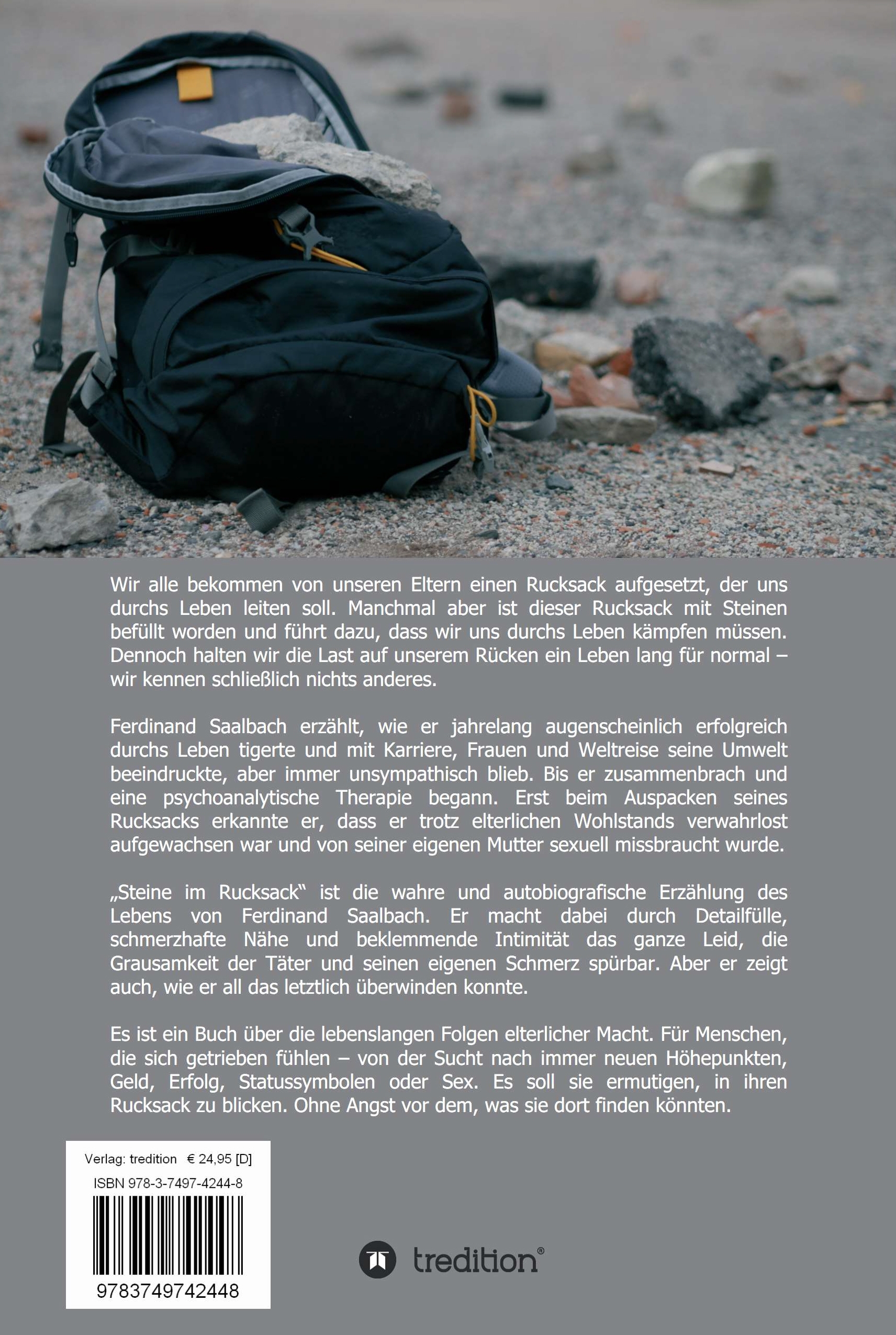 Ferdinand Saalbach wurde 1982 in einer kleinen Stadt nördlich von Karlsruhe in Baden-Württemberg geboren. Nach seinem Studium in Hannover und Hamburg begann er eine Karriere im Agenturbereich, die ihn nach dann nach Dresden und in die Geschäftsleitung einer dort ansässigen Werbeagentur führte. Als er nach gerade mal einem Jahr aus dieser Anstellung gekündigt wurde, brach sein bis dahin heiles Weltbild zusammen und er begann eine psychoanalytische Therapie. Erst in deren Verlauf wurde sichtbar, was ihm als Kind alles angetan wurde und bis heute ein erfülltes Leben erschwert hatte. In seinem Erstlingswerk „Steine im Rucksack“ erzählt Saalbach, wie er sich sein Leben trotz erfolgreicher Karriere immer wieder selbst schwer gemacht hat, führt den Leser durch den Prozess der analytischen Therapie mit all ihren Tiefen und Schmerzen und zeigt durch detailgenaue Erinnerungen die ganze Grausamkeit dessen, was ihm seine Täter angetan haben. Durch die Aufarbeitung seiner Lebensthemen fasste Ferdinand Saalbach den Mut, sich seinen eigenen Wünschen zu stellen und startete 2019 eine Karriere als Moderator, Musiker und Speaker. Anmerkung: Der Name “Ferdinand Saalbach” ist ein eingetragener Künstlername, der verwendet wird, um frei und offen über alle (auch intimen) Details der Lebensgeschichte sprechen zu können, ohne dabei die Persönlichkeitsrechte der beteiligten Personen (auch der Täter*innen) zu berühren.