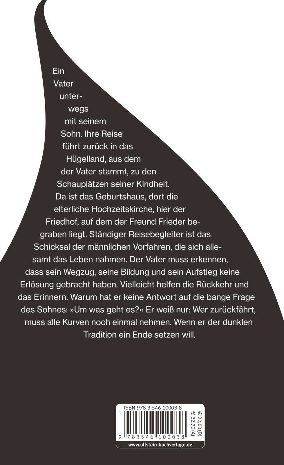 Ständiger Reisebegleiter ist das Schicksal der männlichen Vorfahren, die sich allesamt das Leben nahmen: "Urgroßvater, Großvater, Vater. Ertränkt, erschossen, erhängt." Der Vater muss erkennen, dass sein Wegzug, seine Bildung und sein Aufstieg keine Erlösung gebracht haben.
