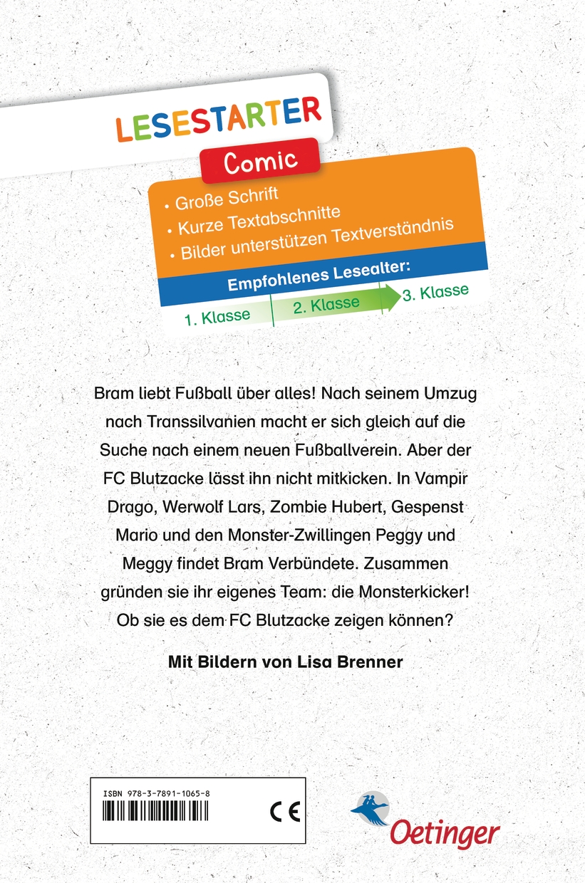 Wie gemein: Beim FC Blutzacke darf Bram nicht mitkicken, weil er zu klein ist. Am Spielfeldrand trifft Bram auf Drago, der ebenfalls nicht aufs Feld darf. Drago aber ist kein gewöhnlicher Junge, sondern ein Vampir. Und er hat viele ebenso ungewöhnliche Freunde, mit denen er und Bram ihr eigenes Team gründen: die Monster-Kicker. Und obwohl Drago unter Sonneneinstrahlung kurzzeitig zu Staub zerfällt, Abwehrwolf Lars seine Wut nicht im Griff hat und die Monster-Zwillinge den Ball lieber fressen, statt ihn ins Tor zu schießen, holen sie zum Schluss den Sieg gegen den FC Blutzacke nach Hause.